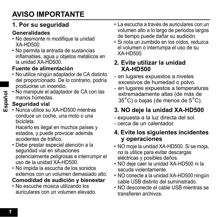 • NE mouillez pas le XA-HD500. S’il était mouillé, n’utilisez pas le XA-HD500 pour éviter tout choc électrique ou dommage. • NE laissez pas tomber le XA-HD500 ni ne le secouez violemment. • NE connectez aucun autre câble USB au XA-HD500 en dehors du câble fourni. • NE déconnectez pas le câble USB pendant le transfert des fichiers.