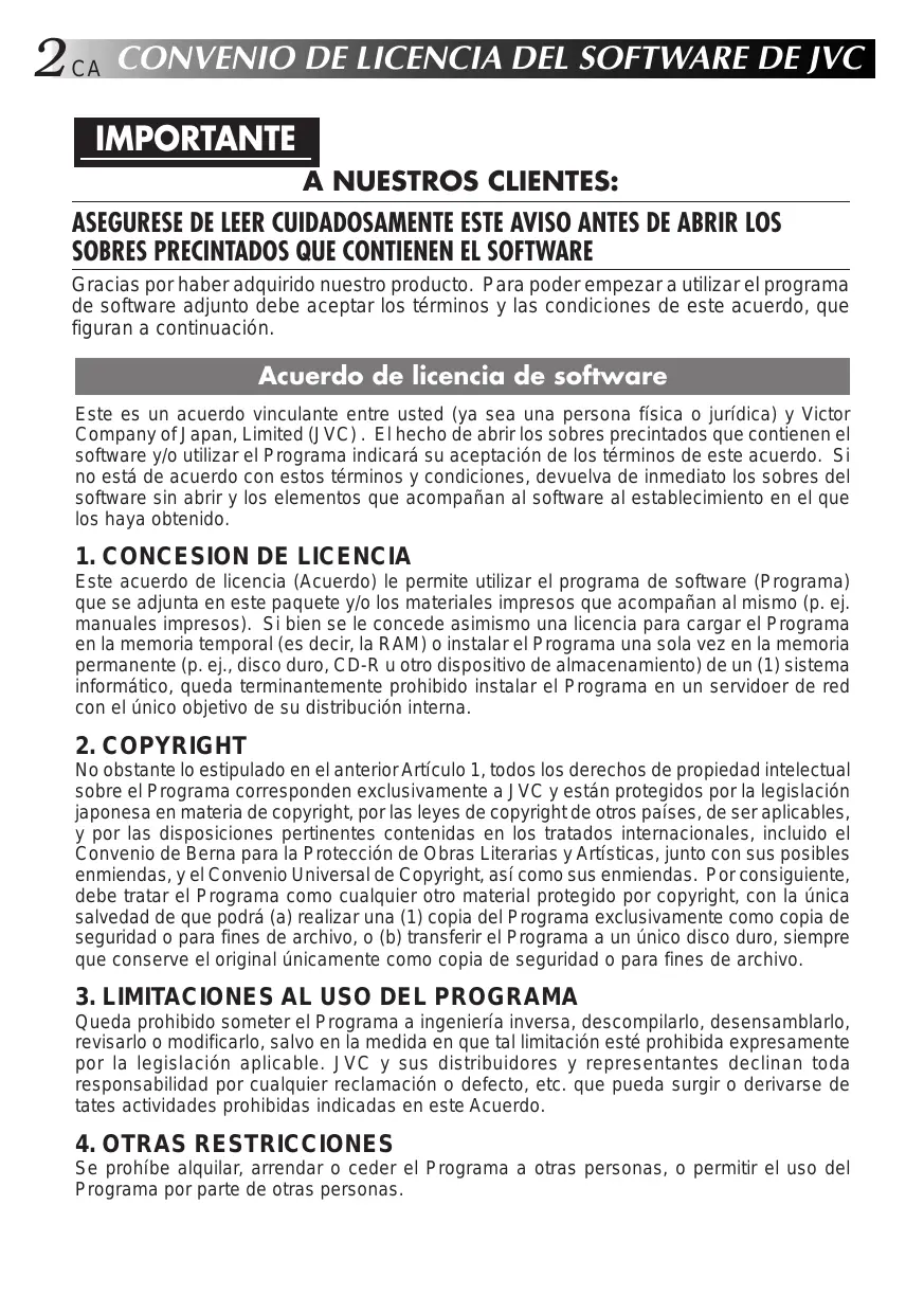 CA CONVENIO DE LICENCIA DEL SOFTWARE DE JVC IMPORTANTE A NUESTROS CLIENTES: ASEGURESE DE LEER CUIDADOSAMENTE ESTE AVISO ANTES DE ABRIR LOS SOBRES PRECINTADOS QUE CONTIENEN EL SOFTWARE Gracias por haber adquirido nuestro producto. Para poder empezar a utilizar el programa de software adjunto debe aceptar los términos y las condiciones de este acuerdo, que figuran a continuación.