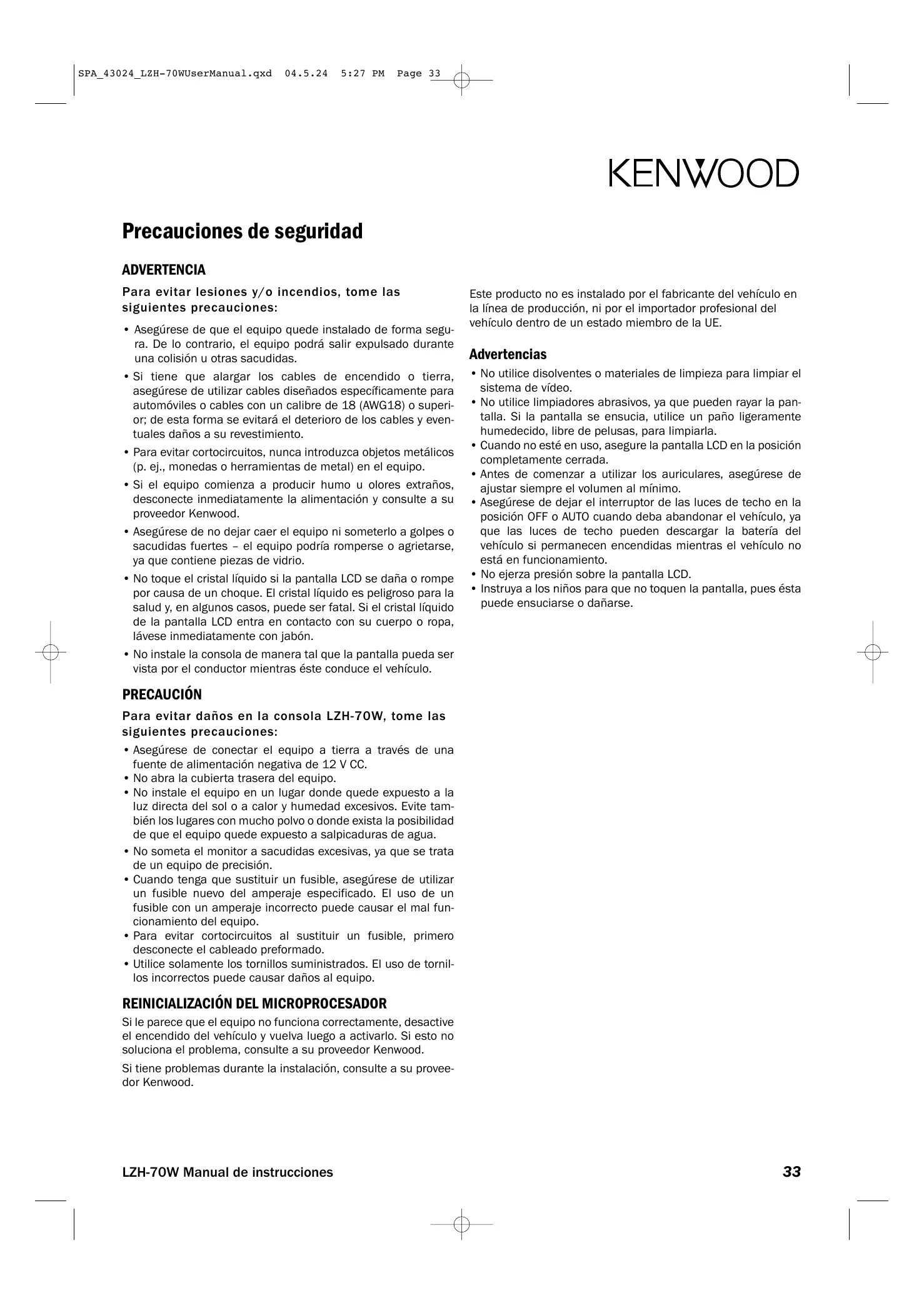 Si le parece que el equipo no funciona correctamente, desactive el encendido del vehículo y vuelva luego a activarlo. Si esto no soluciona el problema, consulte a su proveedor Kenwood. Si tiene problemas durante la instalación, consulte a su proveedor Kenwood. LZH-70W Manual de instrucciones