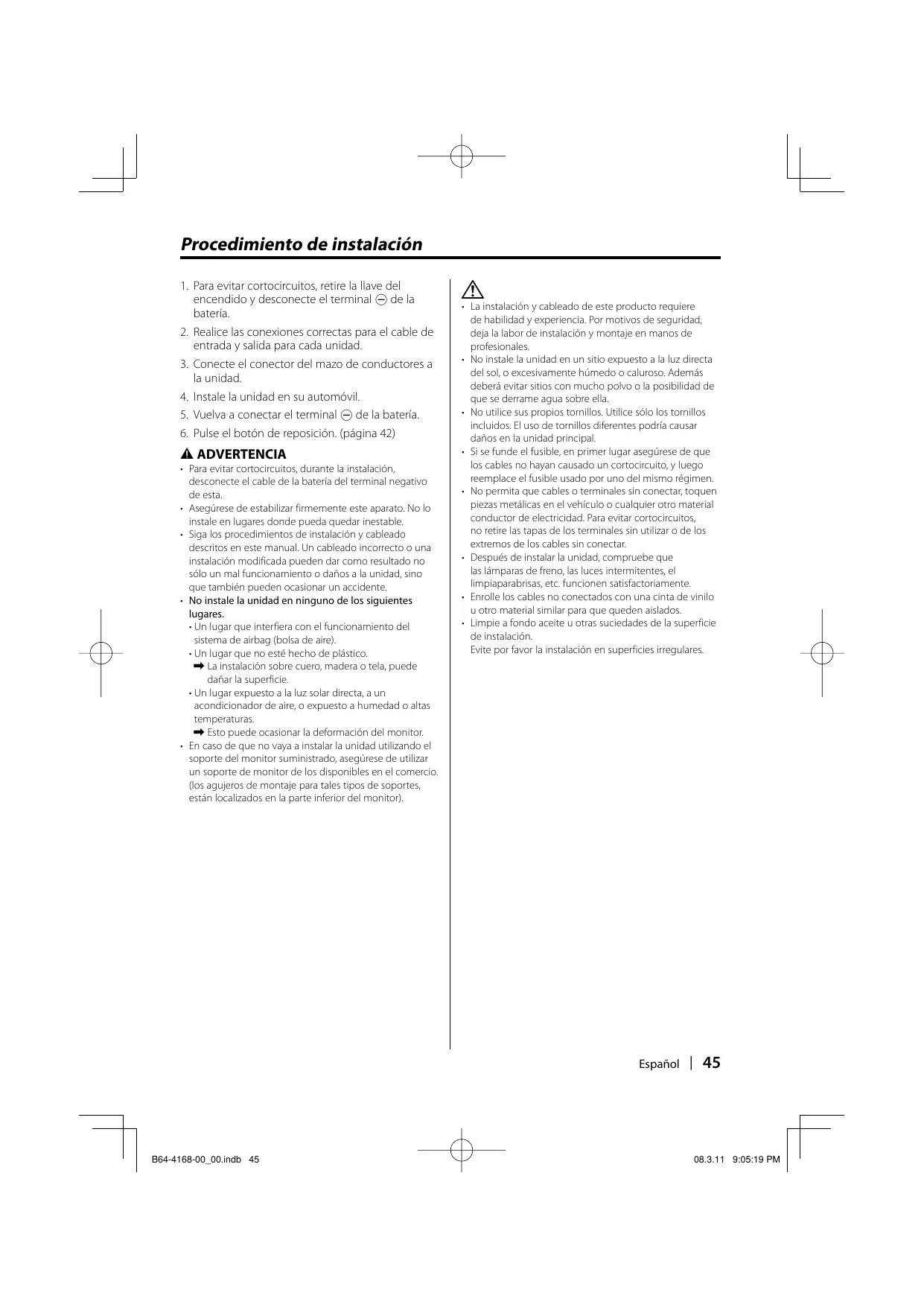 • La instalación y cableado de este producto requiere de habilidad y experiencia. Por motivos de seguridad, deja la labor de instalación y montaje en manos de profesionales. • No instale la unidad en un sitio expuesto a la luz directa del sol, o excesivamente húmedo o caluroso. Además deberá evitar sitios con mucho polvo o la posibilidad de que se derrame agua sobre ella. • No utilice sus propios tornillos. Utilice sólo los tornillos incluidos. El uso de tornillos diferentes podría causar daños en la unidad principal. • Si se funde el fusible, en primer lugar asegúrese de que los cables no hayan causado un cortocircuito, y luego reemplace el fusible usado por uno del mismo régimen. • No permita que cables o terminales sin conectar, toquen piezas metálicas en el vehículo o cualquier otro material conductor de electricidad. Para evitar cortocircuitos, no retire las tapas de los terminales sin utilizar o de los extremos de los cables sin conectar. • Después de instalar la unidad, compruebe que las lámparas de freno, las luces intermitentes, el limpiaparabrisas, etc. funcionen satisfactoriamente. • Enrolle los cables no conectados con una cinta de vinilo u otro material similar para que queden aislados. • Limpie a fondo aceite u otras suciedades de la superficie de instalación. Evite por favor la instalación en superficies irregulares.