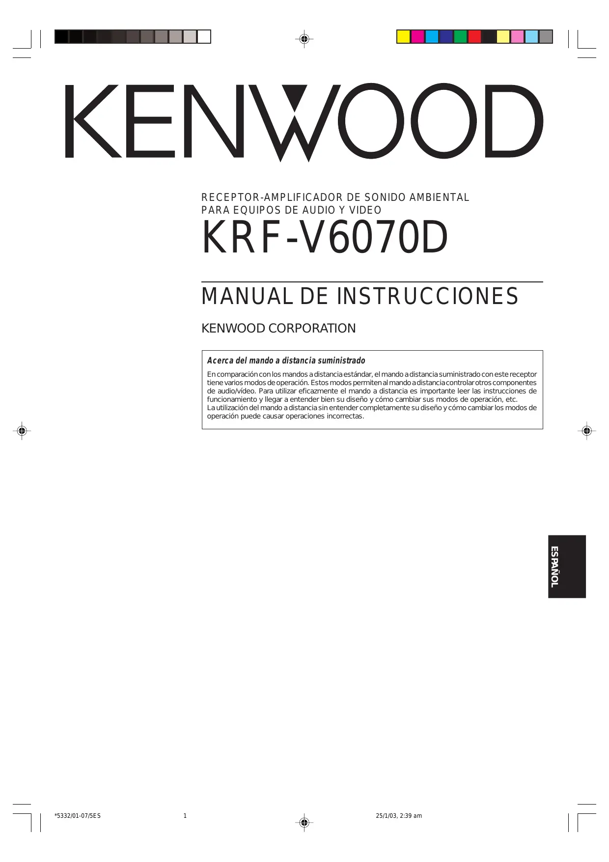 1/21/03, 10:16 PM RECEPTOR-AMPLIFICADOR DE SONIDO AMBIENTAL PARA EQUIPOS DE AUDIO Y VIDEO KRF-V6070D MANUAL DE INSTRUCCIONES KENWOOD CORPORATION Acerca del mando a distancia suministrado En comparación con los mandos a distancia estándar, el mando a distancia suministrado con este receptor tiene varios modos de operación. Estos modos permiten al mando a distancia controlar otros componentes de audio/vídeo. Para utilizar eficazmente el mando a distancia es importante leer las instrucciones de funcionamiento y llegar a entender bien su diseño y cómo cambiar sus modos de operación, etc. La utilización del mando a distancia sin entender completamente su diseño y cómo cambiar los modos de operación puede causar operaciones incorrectas.