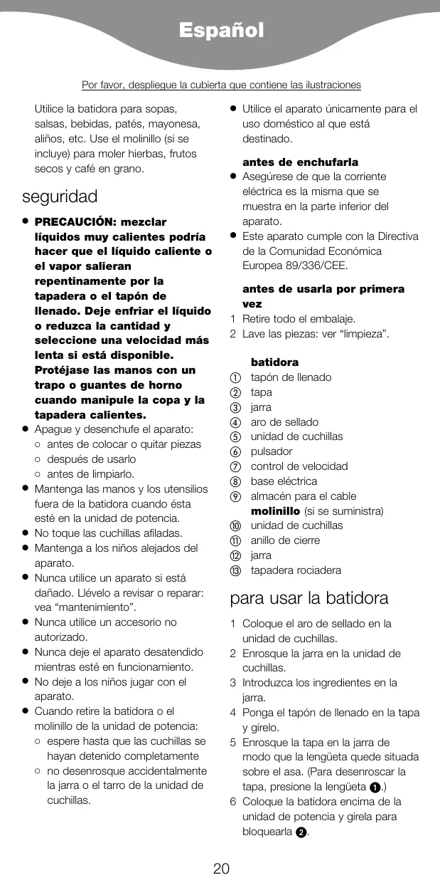 1 Retire todo el embalaje. 2 Lave las piezas: ver “limpieza”. batidora tapón de llenado tapa jarra aro de sellado unidad de cuchillas pulsador control de velocidad base eléctrica almacén para el cable molinillo (si se suministra) unidad de cuchillas anillo de cierre jarra tapadera rociadera