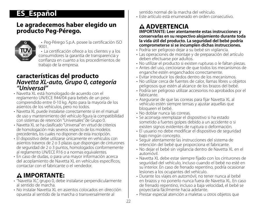 • Podría ser peligroso dejar a su bebé sin vigilancia. • Las operaciones de montaje y de preparación del artículo deben efectuarse por adultos. • No utilizar el producto si existen rupturas o le faltan piezas. • Antes del uso, cerciorarse de que todos los mecanismos de enganche estén enganchados correctamente. • Evitar introducir los dedos dentro de los mecanismos. • No utilizar cerca de fuentes de calor, llamas libres u objetos peligrosos que estén al alcance de los brazos del bebé. • Podría ser peligroso utilizar accesorios no aprobados por el fabricante. • Asegurarse de que las correas para fijar Navetta XL al vehículo estén siempre tensas y ajustar aquellas que bloqueen el bebé. • No doblar nunca las correas. • Se aconseja reemplazar el dispositivo si ha estado sometido a fuertes golpes debido a un accidente o si existen signos evidentes de ruptura o deformación. • El usuario no debe modificar el dispositivo de seguridad bajo ningún concepto. • Seguir atentamente las instrucciones del sistema de retención del bebé que proporciona el fabricante. • No dejar el bebé sin vigilancia dentro de Navetta XL en el automóvil. • Navetta XL debe estar siempre fijado con los cinturones de seguridad del vehículo, incluso cuando el bebé no esté en su interior. En caso de frenado repentino, podría ocasionar lesiones a los ocupantes del vehículo. • Durante los viajes en automóvil, no tener nunca al bebé en brazos y no ponerlo nunca fuera de Navetta XL. En caso de frenado repentino, incluso a baja velocidad, el bebé se proyectaría fácilmente hacia adelante. • Prestar especial atención a maletas u otros objetos que