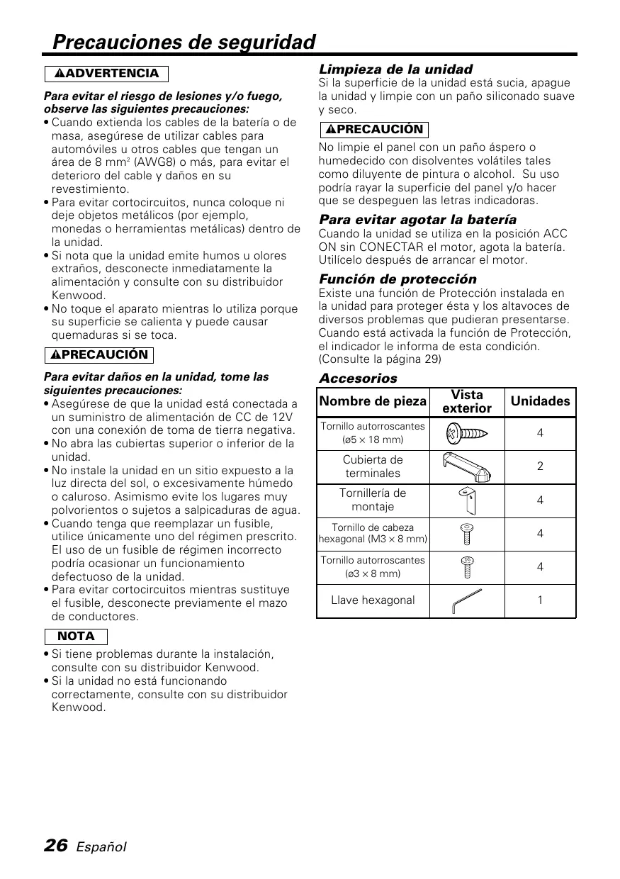 Español Limpieza de la unidad Si la superficie de la unidad está sucia, apague la unidad y limpie con un paño siliconado suave y seco. 2PRECAUCIÓN No limpie el panel con un paño áspero o humedecido con disolventes volátiles tales como diluyente de pintura o alcohol. Su uso podría rayar la superficie del panel y/o hacer que se despeguen las letras indicadoras. Para evitar agotar la batería Cuando la unidad se utiliza en la posición ACC ON sin CONECTAR el motor, agota la batería. Utilícelo después de arrancar el motor. Función de protección Existe una función de Protección instalada en la unidad para proteger ésta y los altavoces de diversos problemas que pudieran presentarse. Cuando está activada la función de Protección, el indicador le informa de esta condición. (Consulte la página 29) Accesorios Nombre de pieza Vista exterior Unidades Tornillo autorroscantes (ø5 × 18 mm)