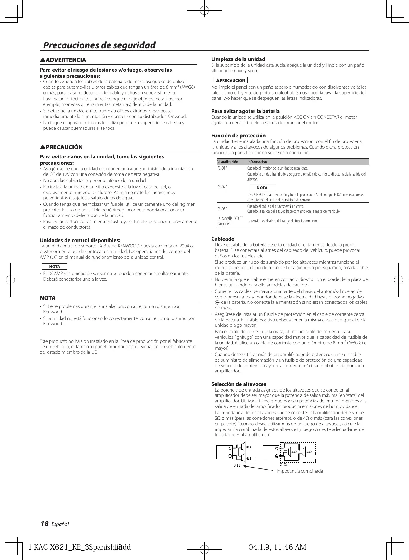 NOTA Desactive el interruptor POWER y libere la protección. Si el mensaje de error continua, consulte al distribuidor KENWOOD. Cuando el cable del altavoz está en corto.