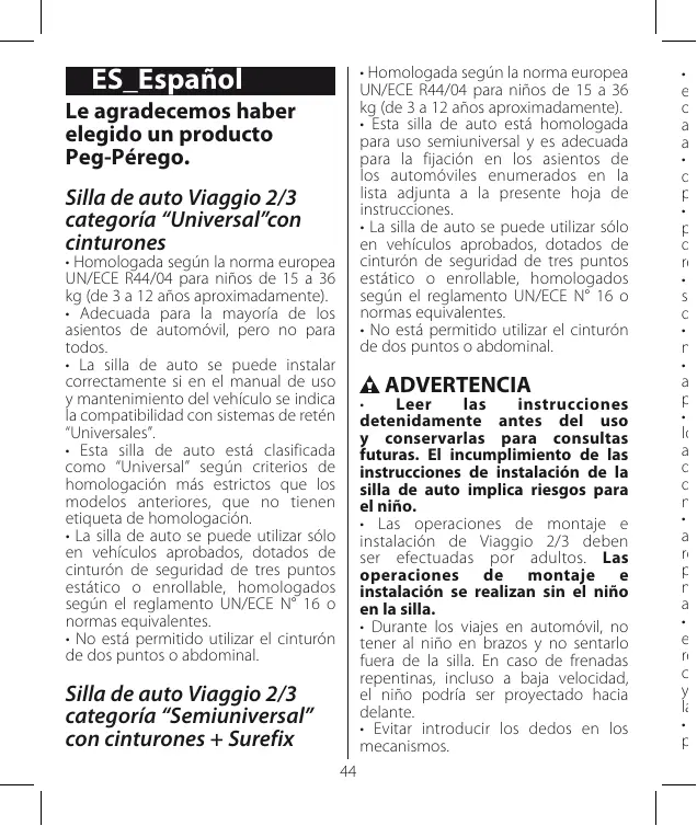 Leer las instrucciones detenidamente antes del uso y conservarlas para consultas futuras. El incumplimiento de las instrucciones de instalación de la silla de auto implica riesgos para el niño. • Las operaciones de montaje e instalación de Viaggio 2/3 deben ser efectuadas por adultos. Las operaciones de montaje e instalación se realizan sin el niño en la silla. • Durante los viajes en automóvil, no tener al niño en brazos y no sentarlo fuera de la silla. En caso de frenadas repentinas, incluso a baja velocidad, el niño podría ser proyectado hacia delante. • Evitar introducir los dedos en los mecanismos.