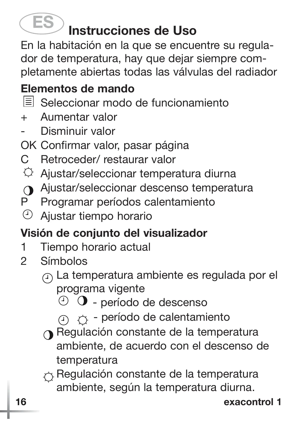 Seleccionar modo de funcionamiento + Aumentar valor - Disminuir valor OK Confirmar valor, pasar página Regulación constante de la temperatura ambiente, según la temperatura diurna. 16