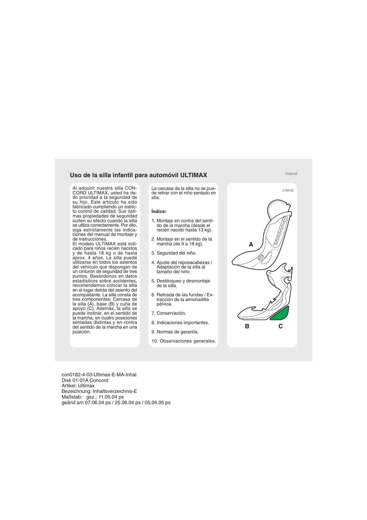 Uso de la silla infantil para automóvil ULTIMAX Al adquirir nuestra silla CONCORD ULTIMAX, usted ha dado prioridad a la seguridad de su hijo. Este artículo ha sido fabricado cumpliendo un estricto control de calidad. Sus óptimas propiedades de seguridad surten su efecto cuando la silla se utiliza correctamente. Por ello, siga estrictamente las indicaciones del manual de montaje y de instrucciones. El modelo ULTIMAX está indicado para niños recién nacidos y de hasta 18 kg o de hasta aprox. 4 años. La silla puede utilizarse en todos los asientos del vehículo que dispongan de un cinturón de seguridad de tres puntos. Basándonos en datos estadísticos sobre accidentes, recomendamos colocar la silla en el lugar detrás del asiento del acompañante. La silla consta de tres componentes: Carcasa de la silla (A), base (B) y cuña de apoyo (C). Además, la silla se puede inclinar, en el sentido de la marcha, en cuatro posiciones sentadas distintas y en contra del sentido de la marcha en una posición. La carcasa de la silla no se puede retirar con el niño sentado en ella. 0106-02 Índice: