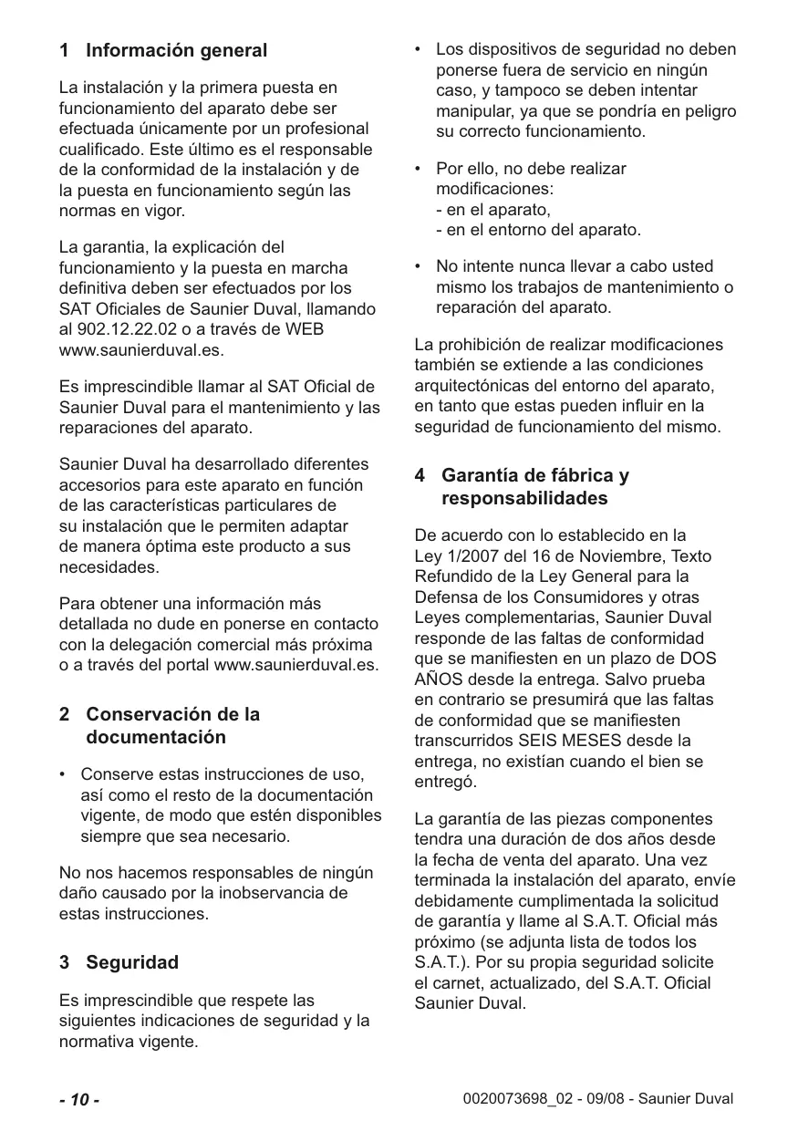 4 Garantía de fábrica y responsabilidades De acuerdo con lo establecido en la Ley 1/2007 del 16 de Noviembre, Texto Refundido de la Ley General para la Defensa de los Consumidores y otras Leyes complementarias, Saunier Duval responde de las faltas de conformidad que se manifiesten en un plazo de DOS AÑOS desde la entrega. Salvo prueba en contrario se presumirá que las faltas de conformidad que se manifiesten transcurridos SEIS MESES desde la entrega, no existían cuando el bien se entregó. La garantía de las piezas componentes tendra una duración de dos años desde la fecha de venta del aparato. Una vez terminada la instalación del aparato, envíe debidamente cumplimentada la solicitud de garantía y llame al S.A.T. Oficial más próximo (se adjunta lista de todos los S.A.T.). Por su propia seguridad solicite el carnet, actualizado, del S.A.T. Oficial Saunier Duval.