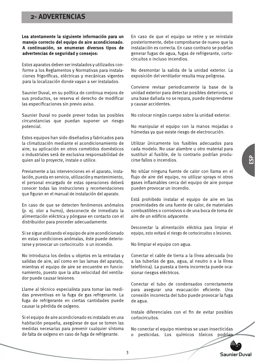 Saunier Duval no puede prever todas las posibles circunstancias que puedan suponer un riesgo potencial. Estos equipos han sido diseñados y fabricados para la climatización mediante el acondicionamiento de aire; su aplicación en otros cometidos domésticos o industriales será de exclusiva responsabilidad de quien así lo proyecte, instale o utilice.