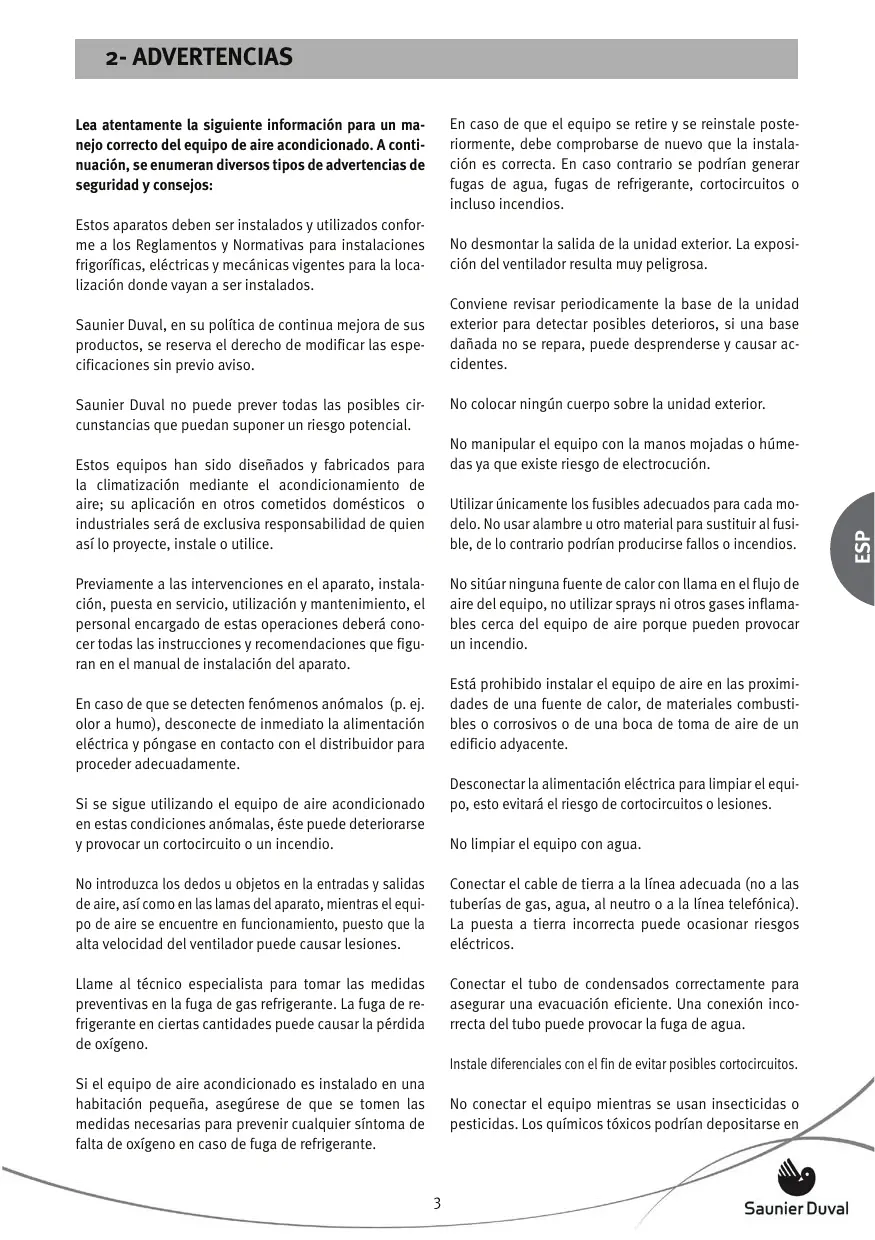 10.4- CUIDADOS GENERALES Si no tiene previsto utilizar la unidad durante unos días: Poner en funcionamiento el ventilador durante tres o cuatro horas para secar el interior de la unidad; detener la unidad y desconectar el interruptor magnetotérmico; limpiar los filtros del aire; y retirar las pilas del mando a distancia. Antes de volver a poner la unidad en marcha realice las siguientes comprobaciones: que estén instalados los filtros de aire, que la salida y la entrada de aire no estén bloqueadas, que el mando a distancia tenga pilas, que el interruptor diferencial esté conectado. Comprobar ocasionalmente la base de la unidad exterior. Si la base está dañada o deteriorada, la unidad puede caerse y provocar daños físicos y materiales. Aconsejamos contrate con su instalador de confianza o con el Servicio Técnico Oficial de Saunier Duval un servicio de mantenimiento preventivo, esto ayudará a alargar la vida y mejorará el rendimiento del equipo.