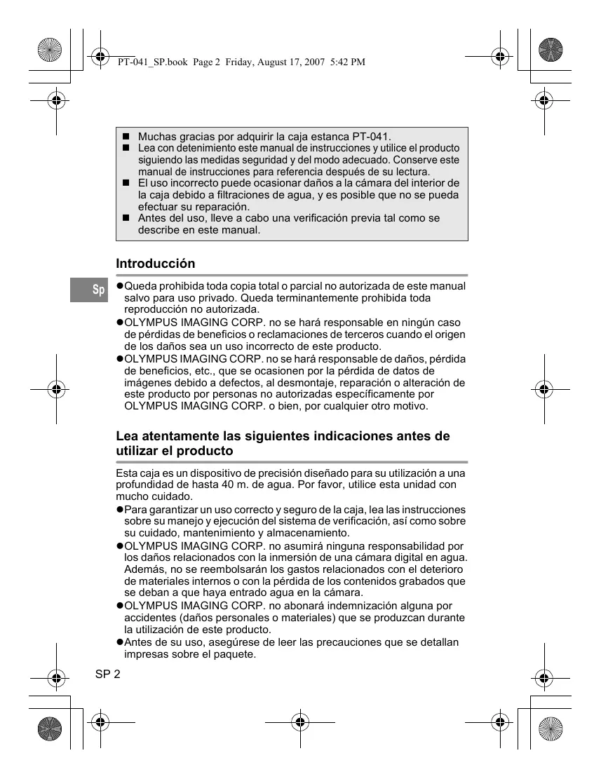 Esta caja es un dispositivo de precisión diseñado para su utilización a una profundidad de hasta 40 m. de agua. Por favor, utilice esta unidad con mucho cuidado. zPara garantizar un uso correcto y seguro de la caja, lea las instrucciones sobre su manejo y ejecución del sistema de verificación, así como sobre su cuidado, mantenimiento y almacenamiento. zOLYMPUS IMAGING CORP. no asumirá ninguna responsabilidad por los daños relacionados con la inmersión de una cámara digital en agua. Además, no se reembolsarán los gastos relacionados con el deterioro de materiales internos o con la pérdida de los contenidos grabados que se deban a que haya entrado agua en la cámara. zOLYMPUS IMAGING CORP. no abonará indemnización alguna por accidentes (daños personales o materiales) que se produzcan durante la utilización de este producto. zAntes de su uso, asegúrese de leer las precauciones que se detallan impresas sobre el paquete.