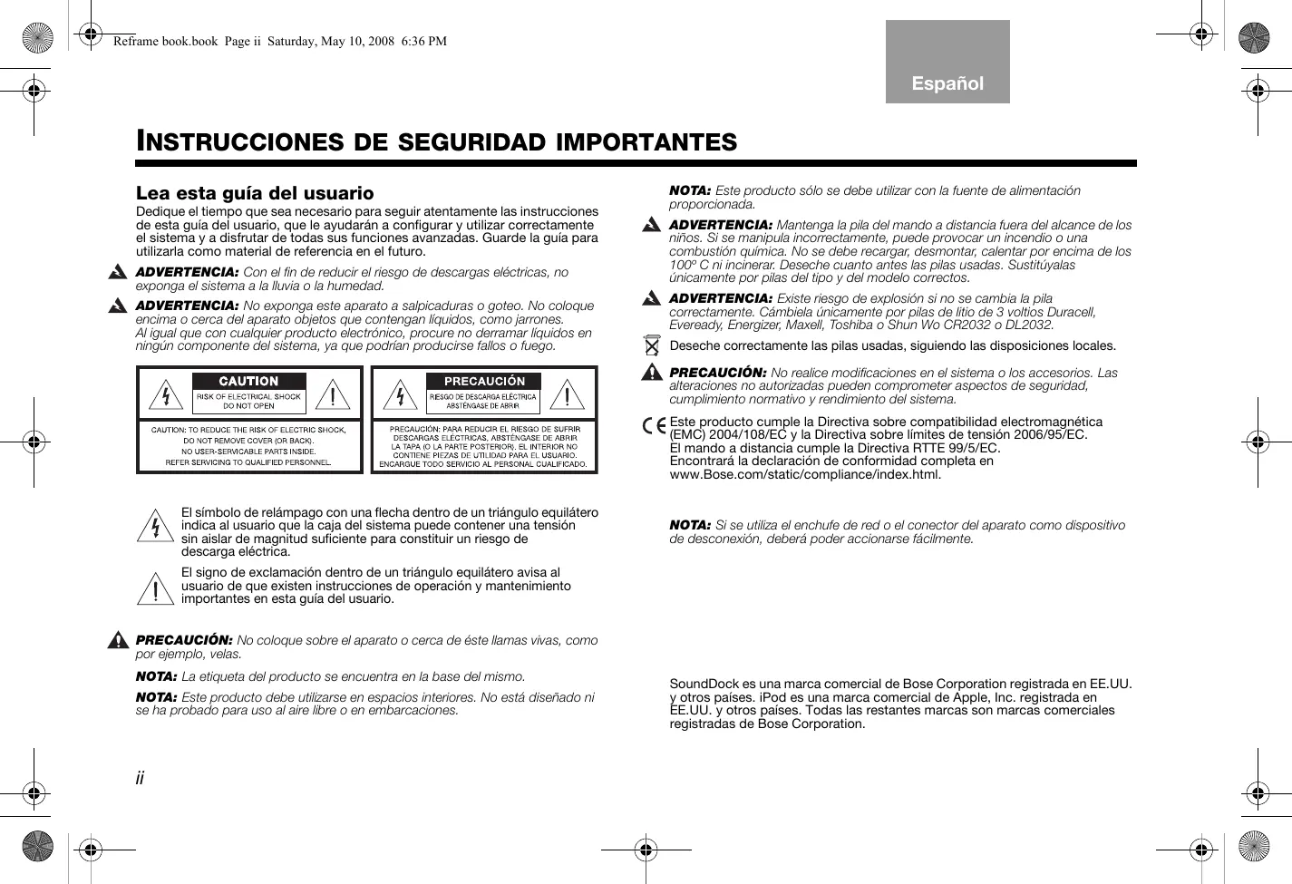 SoundDock es unamarcacommercialde BoseCorporationregistration enEE.UU. yotrospaises.IPodesunamarcacomercialdeApple,Inc.registrarene EE.UU.yotrospaises.Todaslasrestantesmarcassonmarcascomerciales registrasdase BoseCorporation.