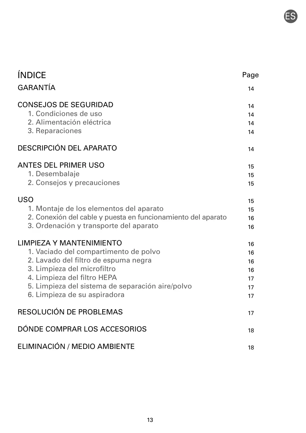 El aire que respiramos contiene partículas que pueden provocar alergias: larvas y excrementos de los ácaros, hongos, polen, humos y residuos de animales (pelos, piel, saliva y orina). Las partículas más finas penetran profundamente en nuestro sistema respiratorio, donde pueden provocar una inflamación y alterar la función respiratoria en su conjunto. Los filtros (H)EPA, o (High) Efficiency Particulate Air Filter (filtros de eficacia elevada para partículas aéreas) permiten retener las partículas más finas. Gracias al filtro (H)EPA, el aire que se vuelve a expulsar a la estancia es más sano que el aire aspirado ATENCIÓN No supere nunca el nivel máximo (6) mencionado en el compartimento para polvo. 2 • Lave el filtro de espuma negra (18a) IMPORTANTE Cada 6 meses o cuando la aspiración no resulte satisfactoria, lave el filtro de espuma negra. Presione el botón de apertura de la tapa (fig.21). Bascule la tapa hacia atrás (fig.22). Retire el filtro de espuma negra (fig.23), lávelo y escúrralo (fig.24). Déjelo secar como mínimo 12 h antes de volverlo a colocar. IMPORTANTE Apague y desconecte siempre la aspiradora antes de proceder a su mantenimiento o a su limpieza. Compruebe totalmente su aspiradora, así como los distintos filtros, y límpielos con regularidad. ATENCIÓN Deje secar completamente el filtro de espuma negra y compruebe que esté bien seco antes de volverlo a colocar en el aparato. ATENCIÓN No ponga en marcha nunca su aspiradora sin un sistema de filtración (espuma, microfiltro y filtro). Vuelva a colocar el filtro de espuma negra y cierre de nuevo la tapa. 1 • Vacíe el compartimento de polvo (5) Después de cada uso, vacíe el compartimento de polvo como se indica a continuación: Agarre el compartimento de polvo por el asa y tire de él (fig.15). Separe el compartimento para polvo fino (5b) del compartimento principal (5a) (Fig.16). Vacíe el compartimento principal en una papelera (Fig.17) y luego vacíe el compartimento para polvo fino (5b) (Fig.18). Limpie las juntas del compartimento con ayuda de un paño. Vuelva a colocar el compartimento para polvo fino sobre el compartimento principal (Fig.19) y luego vuelva a colocar el compartimento para polvo en su lugar (fig.20). IMPORTANTE Lave el microfiltro cada 6 meses.
