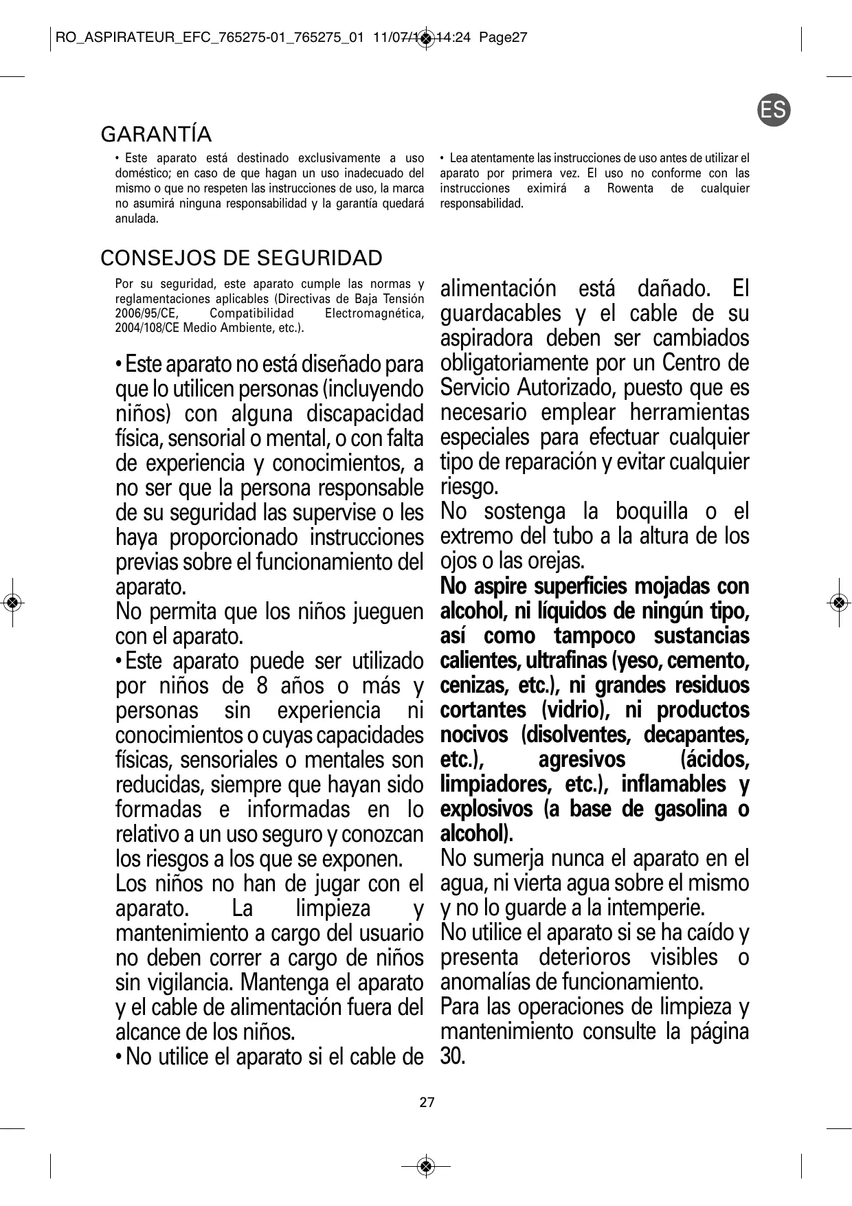 Servicio Autorizado, puesto que es necesario emplear herramientas especiales para efectuar cualquier tipo de reparación y evitar cualquier riesgo. No sostenga la boquilla o el extremo del tubo a la altura de los ojos o las orejas. No aspire superficies mojadas con alcohol, ni líquidos de ningún tipo, así como tampoco sustancias calientes, ultrafinas (yeso, cemento, cenizas, etc.), ni grandes residuos cortantes (vidrio), ni productos nocivos (disolventes, decapantes, etc.), agresivos (ácidos, limpiadores, etc.), inflamables y explosivos (a base de gasolina o alcohol). No sumerja nunca el aparato en el agua, ni vierta agua sobre el mismo y no lo guarde a la intemperie. No utilice el aparato si se ha caído y presenta deterioros visibles o anomalías de funcionamiento. Para las operaciones de limpieza y mantenimiento consulte la página 30.