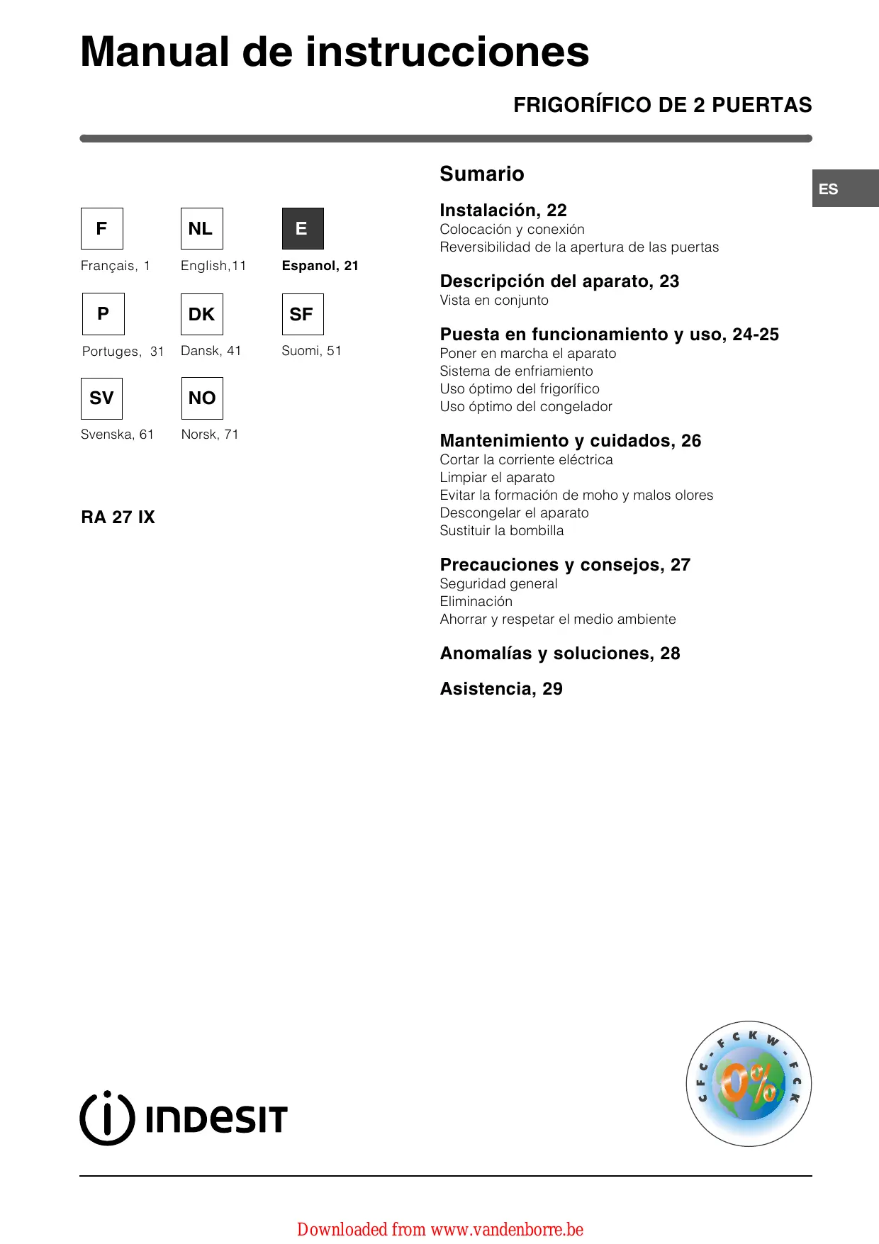 RA 27 IX - Refrigerador INDESIT - Manual de uso y guía de instrucciones gratis