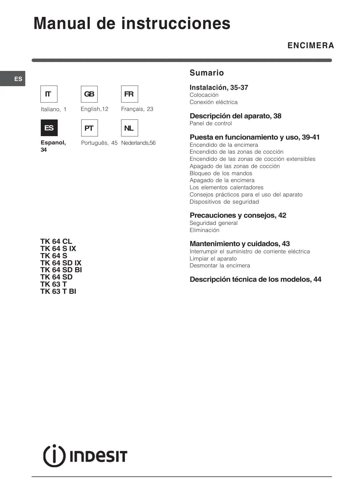 MANUAL DE USUARIO TK 64 S IX INDESIT