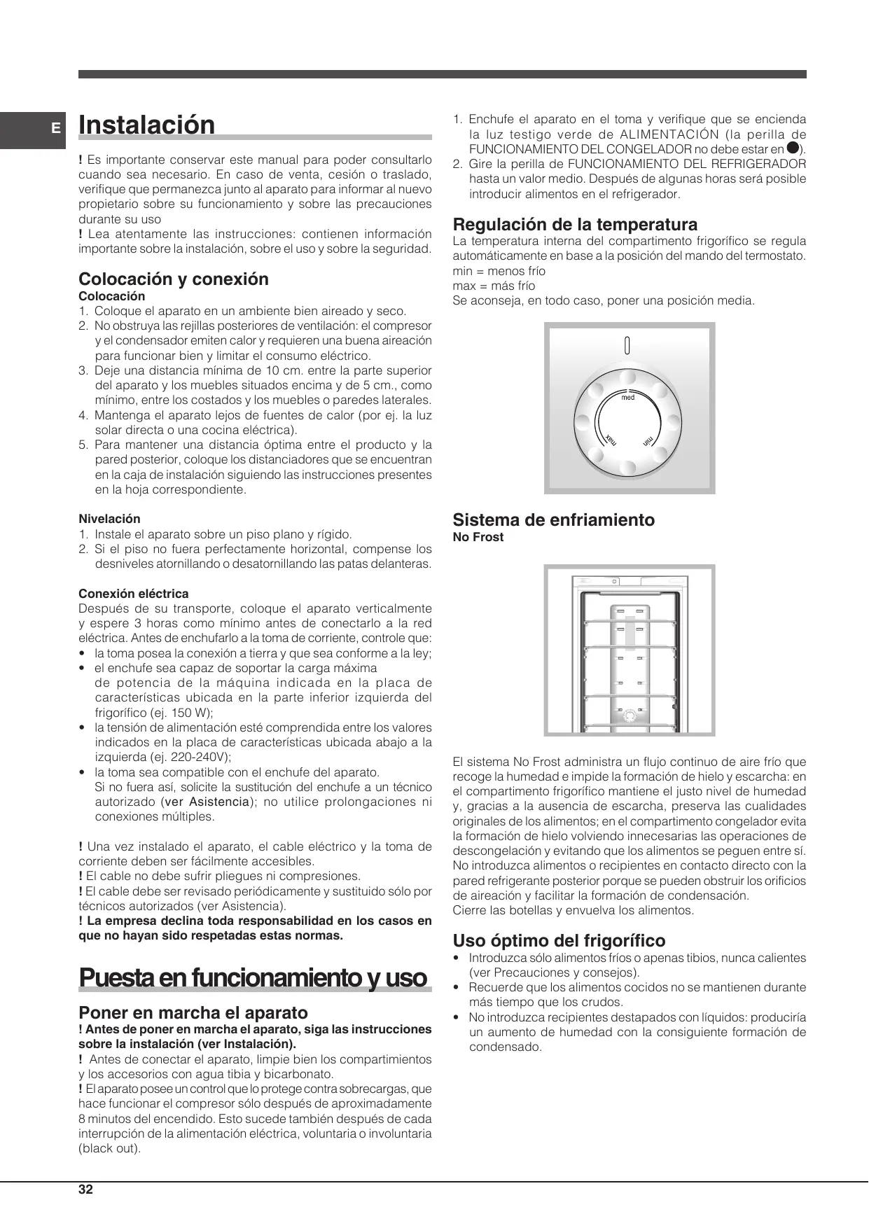 • De deuren sluiten niet goed of de afdichtingen zijn versleten. • De deuren worden vaak geopend. • De knop van de TEMPERATUURREGELING staat niet op de goede stand • De koelkast of de diepvrieskast zijn overmatig gevuld. • De temperatuur van het vertrek waar het apparaat zich bevindt is lager dan 14°C. In de koelkast bevriezen de etenswaren. • De knop van de TEMPERATUURREGELING staat niet op de goede stand • De levensmiddelen staan in contact met de achterwand. De motor blijft doorlopend draaien • De deur is niet goed dicht of wordt constant geopend. • De buitentemperatuur is erg hoog. Het apparaat maakt veel lawaai. • la tensión de alimentación esté comprendida entre los valores indicados en la placa de características ubicada abajo a la izquierda (ej. 220-240V); • la toma sea compatible con el enchufe del aparato. Si no fuera así, solicite la sustitución del enchufe a un técnico autorizado (ver Asistencia); no utilice prolongaciones ni conexiones múltiples. ! Una vez instalado el aparato, el cable eléctrico y la toma de corriente deben ser fácilmente accesibles. ! El cable no debe sufrir pliegues ni compresiones. Regulación de la temperatura
