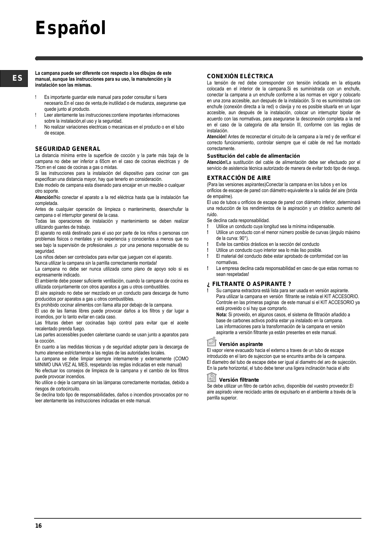 ES La campana puede ser diferente con respecto a los dibujos de este manual, aunque las instrucciones para su uso, la manutención y la instalación son las mismas. ! ! !