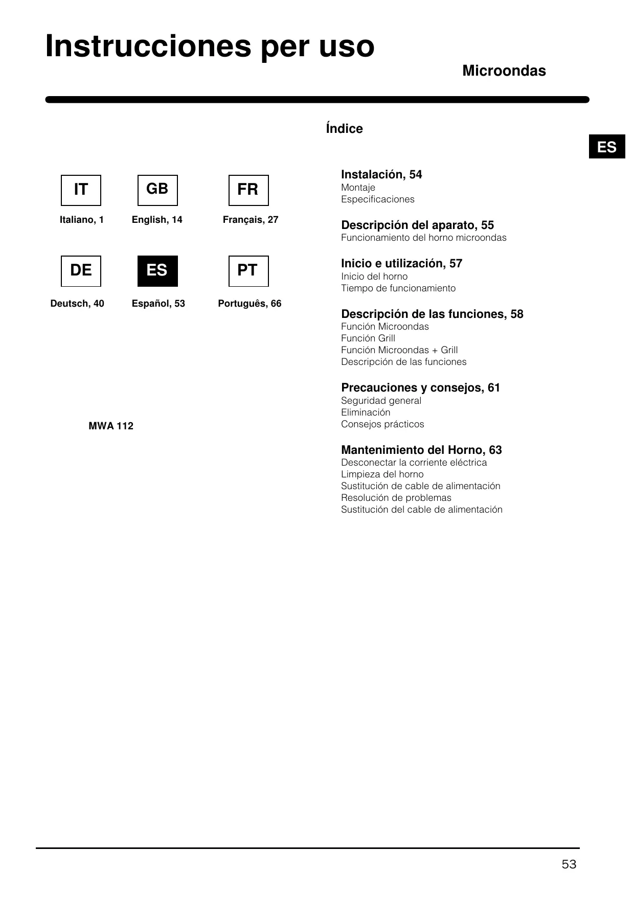 Español, 53 Português, 66 Inicio e utilización, 57 Inicio del horno Tiempo de funcionamiento Descripción de las funciones, 58 Función Microondas Función Grill Función Microondas + Grill Descripción de las funciones Precauciones y consejos, 61 MWA 112 Seguridad general Eliminación Consejos prácticos Mantenimiento del Horno, 63 Desconectar la corriente eléctrica Limpieza del horno Sustitución de cable de alimentación Resolución de problemas Sustitución del cable de alimentación