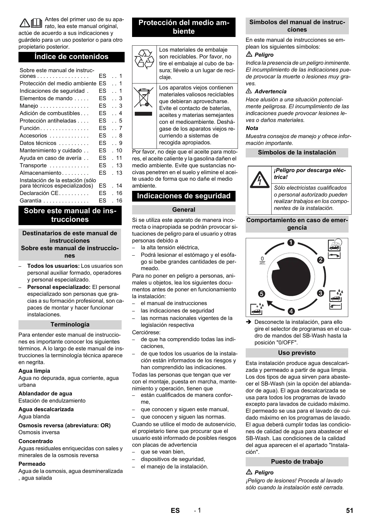 General Si se utiliza este aparato de manera incorrecta o inapropiada se podrán provocar situaciones de peligro para el usuario y otras personas debido a – la alta tensión eléctrica, – Podrá lesionar el estómago y el esófago si bebe grandes cantidades de permeado. Para no poner en peligro a personas, animales u objetos, lea los siguientes documentos antes de poner en funcionamiento la instalación: – el manual de instrucciones – las indicaciones de seguridad – las normas nacionales vigentes de la legislación respectiva Cerciórese: – de que ha comprendido todas las indicaciones, – de que todos los usuarios de la instalación están informados de los riesgos y han comprendido las indicaciones. Todas las personas que tengan que ver con el montaje, puesta en marcha, mantenimiento y operación, tienen que – están cualificados de manera conforme, – que conocen y siguen este manual, – que conocen y siguen las normas. Cuando se utilice el modo de autoservicio, el propietario tiene que procurar que el usuario esté informado de posibles riesgos con placas de advertencia – que se vean bien, – dispositivos de seguridad, – el manejo de la instalación.