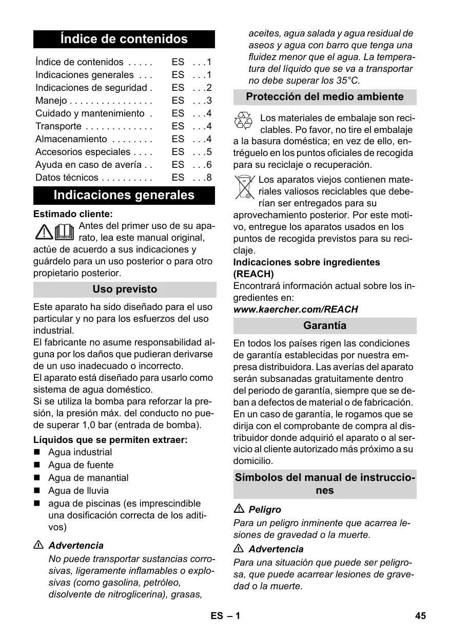 aceites, agua salada y agua residual de aseos y agua con barro que tenga una fluidez menor que el agua. La temperatura del líquido que se va a transportar no debe superar los 35°C. Índice de contenidos Índice de contenidos . . . . . Indicaciones generales . . . Indicaciones de seguridad . Manejo . . . . . . . . . . . . . . . . Cuidado y mantenimiento . Transporte . . . . . . . . . . . . . Almacenamiento . . . . . . . . Accesorios especiales . . . . Ayuda en caso de avería . . Datos técnicos . . . . . . . . . . Indicaciones generales Estimado cliente: Antes del primer uso de su aparato, lea este manual original, actúe de acuerdo a sus indicaciones y guárdelo para un uso posterior o para otro propietario posterior. Uso previsto Este aparato ha sido diseñado para el uso particular y no para los esfuerzos del uso industrial. El fabricante no asume responsabilidad alguna por los daños que pudieran derivarse de un uso inadecuado o incorrecto. El aparato está diseñado para usarlo como sistema de agua doméstico. Si se utiliza la bomba para reforzar la presión, la presión máx. del conducto no puede superar 1,0 bar (entrada de bomba). Líquidos que se permiten extraer: Agua industrial Agua de fuente Agua de manantial Agua de lluvia agua de piscinas (es imprescindible una dosificación correcta de los aditivos) Protección del medio ambiente Los materiales de embalaje son reciclables. Po favor, no tire el embalaje a la basura doméstica; en vez de ello, entréguelo en los puntos oficiales de recogida para su reciclaje o recuperación. Los aparatos viejos contienen materiales valiosos reciclables que deberían ser entregados para su aprovechamiento posterior. Por este motivo, entregue los aparatos usados en los puntos de recogida previstos para su reciclaje. Indicaciones sobre ingredientes (REACH) Encontrará información actual sobre los ingredientes en: www.kaercher.com/REACH Garantía En todos los países rigen las condiciones de garantía establecidas por nuestra empresa distribuidora. Las averías del aparato serán subsanadas gratuitamente dentro del periodo de garantía, siempre que se deban a defectos de material o de fabricación. En un caso de garantía, le rogamos que se dirija con el comprobante de compra al distribuidor donde adquirió el aparato o al servicio al cliente autorizado más próximo a su domicilio. Símbolos del manual de instrucciones Peligro 몇 Advertencia No puede transportar sustancias corrosivas, ligeramente inflamables o explosivas (como gasolina, petróleo, disolvente de nitroglicerina), grasas, Para un peligro inminente que acarrea lesiones de gravedad o la muerte. 몇 Advertencia Para una situación que puede ser peligrosa, que puede acarrear lesiones de gravedad o la muerte. ES – 1