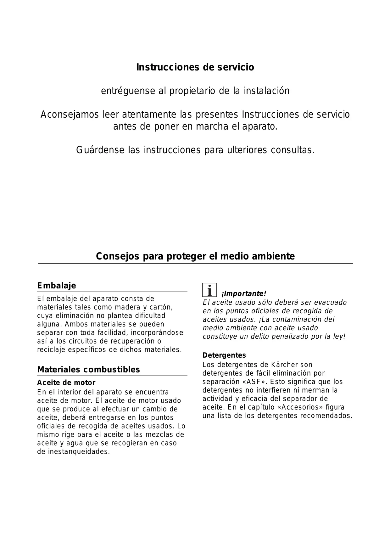 Instrucciones de servicio entréguense al propietario de la instalaciôn Aconsejamos leer atentamente las presentes Instrucciones de servicio antes de poner en marcha el aparato. Guärdense las instrucciones para ulteriores consultas. Consejos para proteger el medio ambiente Embalaje El embalaje del aparato consta de materiales tales como madera y cartén, cuya eliminacién no plantea dificultad alguna. Ambos materiales se pueden separar con toda facilidad, incorporéndose asi a los circuitos de recuperacién o reciclaje especificos de dichos materiales. Materiales combustibles 1 ilmportante! Aceite de motor En elinterior del aparato se encuentra aceite de motor. El aceite de motor usado que se produce al efectuar un cambio de aceite, deberé entregarse en los puntos oficiales de recogida de aceites usados. Lo mismo rige para el aceite o las mezclas de aceite y agua que se recogieran en caso de inestanqueidades. El aceite usado sélo deberé ser evacuado en los puntos oficiales de recogida de aceites usados. jLa contaminaciôn del medio ambiente con aceite usado constituye un delito penalizado por la ley! Detergentes Los detergentes de Kärcher son detergentes de fécil eliminacién por separaciôn «ASF». Esto significa que los detergentes no interfieren ni merman la actividad y eficacia del separador de aceite. En el capitulo «Accesorios» figura una lista de los detergentes recomendados.