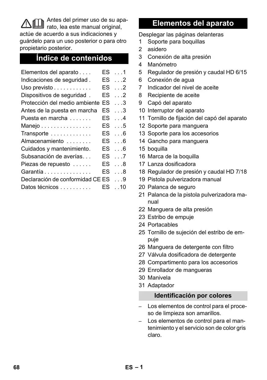 Elementos del aparato Desplegar las páginas delanteras 1 Soporte para boquillas 2 asidero 3 Conexión de alta presión 4 Manómetro 5 Regulador de presión y caudal HD 6/15 6 Conexión de agua 7 Indicador del nivel de aceite 8 Recipiente de aceite 9 Capó del aparato 10 Interruptor del aparato 11 Tornillo de fijación del capó del aparato 12 Soporte para manguera 13 Soporte para los accesorios 14 Gancho para manguera 15 boquilla 16 Marca de la boquilla 17 Lanza dosificadora 18 Regulador de presión y caudal HD 7/18 19 Pistola pulverizadora manual 20 Palanca de seguro 21 Palanca de la pistola pulverizadora manual 22 Manguera de alta presión 23 Estribo de empuje 24 Portacables 25 Tornillo de sujeción del estribo de empuje 26 Manguera de detergente con filtro 27 Válvula dosificadora de detergente 28 Compartimento para los accesorios 29 Enrollador de mangueras 30 Manivela 31 Adaptador Identificación por colores