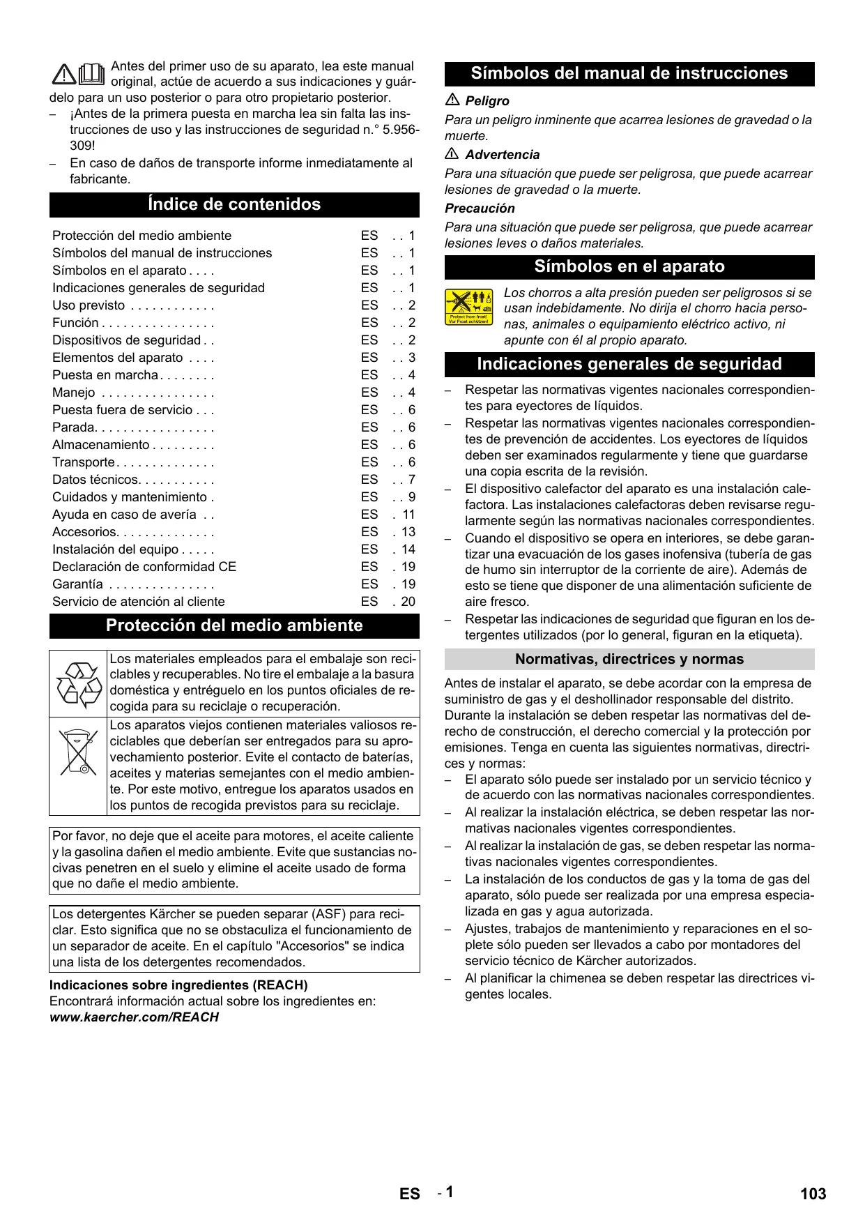 Protección del medio ambiente Los materiales empleados para el embalaje son reciclables y recuperables. No tire el embalaje a la basura doméstica y entréguelo en los puntos oficiales de recogida para su reciclaje o recuperación. Los aparatos viejos contienen materiales valiosos reciclables que deberían ser entregados para su aprovechamiento posterior. Evite el contacto de baterías, aceites y materias semejantes con el medio ambiente. Por este motivo, entregue los aparatos usados en los puntos de recogida previstos para su reciclaje. Por favor, no deje que el aceite para motores, el aceite caliente y la gasolina dañen el medio ambiente. Evite que sustancias nocivas penetren en el suelo y elimine el aceite usado de forma que no dañe el medio ambiente. Los detergentes Kärcher se pueden separar (ASF) para reciclar. Esto significa que no se obstaculiza el funcionamiento de un separador de aceite. En el capítulo "Accesorios" se indica una lista de los detergentes recomendados. Indicaciones sobre ingredientes (REACH) Encontrará información actual sobre los ingredientes en: www.kaercher.com/REACH