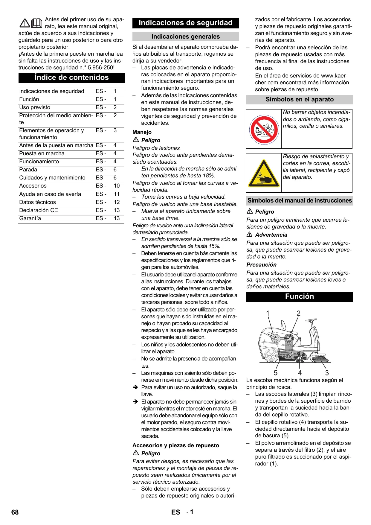 zados por el fabricante. Los accesorios y piezas de repuesto originales garantizan el funcionamiento seguro y sin averías del aparato. Podrá encontrar una selección de las piezas de repuesto usadas con más frecuencia al final de las instrucciones de uso. En el área de servicios de www.kaercher.com encontrará más información sobre piezas de repuesto. Símbolos en el aparato No barrer objetos incendiados o ardiendo, como cigarrillos, cerilla o similares. Riesgo de aplastamiento y cortes en la correa, escobilla lateral, recipiente y capó del aparato. Símbolos del manual de instrucciones Peligro Para un peligro inminente que acarrea lesiones de gravedad o la muerte. 몇 Advertencia Para una situación que puede ser peligrosa, que puede acarrear lesiones de gravedad o la muerte. Precaución Para una situación que puede ser peligrosa, que puede acarrear lesiones leves o daños materiales. Función La escoba mecánica funciona según el principio de rosca. – Las escobas laterales (3) limpian rincones y bordes de la superficie de barrido y transportan la suciedad hacia la banda del cepillo rotativo. – El cepillo rotativo (4) transporta la suciedad directamente hacia el depósito de basura (5). – El polvo arremolinado en el depósito se separa a través del filtro (2), y el aire puro filtrado es succionado por el aspirador (1). Uso previsto Utilice la escoba mecánica únicamente de conformidad con las indicaciones del presente manual de instrucciones. Î Antes de utilizar el equipo con sus dispositivos de trabajo, compruebe que esté en perfecto estado y que garantice la seguridad durante el servicio. Si no está en perfecto estado, no debe utilizarse. – Esta escoba mecánica está diseñada para barrer superficies sucias en la zona interior y exterior. – El aparato no está apto para el uso en la vía pública. – El aparato no es apto para aspirar polvos nocivos para la salud. – No se debe efectuar ningún tipo de modificación en el aparato. – ¡No aspire/barra nunca líquidos explosivos, gases inflamables ni ácidos o disolventes sin diluir! Entre éstos se encuentran la gasolina, los diluyentes o el fuel, que pueden mezclarse con el aire aspirado dando lugar a combinaciones o vapores explosivos. No utilice tampoco acetona, ácidos ni disolventes sin diluir, ya que ellos atacan los materiales utilizados en el aparato. – No aspire/barra objetos incandescentes, con o sin llama. – El aparato es apto únicamente para los revestimientos indicados en el manual de instrucciones. – La máquina debe ser conducida únicamente sobre las superficies especificadas por la empresa o su representante. – Está prohibido permanecer en la zona de peligro. Está prohibido usar el aparato en zonas en las que exista riesgo de explosiones. – Norma de validez general: Mantenga lejos del aparato los materiales fácilmente inflamables (peligro de explosión/incendio). Protección del medio ambiente Los materiales empleados para el embalaje son reciclables y recuperables. No tire el embalaje a la basura doméstica y entréguelo en los puntos oficiales de recogida para su reciclaje o recuperación. Los aparatos viejos contienen materiales valiosos reciclables que deberían ser entregados para su aprovechamiento posterior. Evite el contacto de baterías, aceites y materias semejantes con el medioambiente. Por este motivo, entregue los aparatos usados en los puntos de recogida previstos para su reciclaje. Indicaciones sobre ingredientes (REACH) Encontrará información actual sobre los ingredientes en: http://www.karcher.de/de/unternehmen/ umweltschutz/REACH.htm Revestimientos adecuados