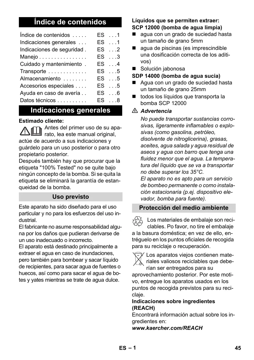 6.997-419.0 Kit de flexibles plats de 1" (25,4 mm), 10 m Índice de contenidos Índice de contenidos . . . . . Indicaciones generales . . . Indicaciones de seguridad . Manejo . . . . . . . . . . . . . . . . Cuidado y mantenimiento . Transporte . . . . . . . . . . . . . Almacenamiento . . . . . . . . Accesorios especiales . . . . Ayuda en caso de avería . . Datos técnicos . . . . . . . . . . Indicaciones generales Estimado cliente: Antes del primer uso de su aparato, lea este manual original, actúe de acuerdo a sus indicaciones y guárdelo para un uso posterior o para otro propietario posterior. Después también hay que procurar que la etiqueta "100% Tested" no se quite bajo ningún concepto de la bomba. Si se quita la etiqueta se eliminará la garantía de estanqueidad de la bomba. Uso previsto Este aparato ha sido diseñado para el uso particular y no para los esfuerzos del uso industrial. El fabricante no asume responsabilidad alguna por los daños que pudieran derivarse de un uso inadecuado o incorrecto. El aparato está destinado principalmente a extraer el agua en caso de inundaciones, pero también para bombear y sacar líquido de recipientes, para sacar agua de fuentes o huecos, así como para sacar el agua de botes y yates mientras se trate de agua dulce. Líquidos que se permiten extraer: SCP 12000 (bomba de agua limpia) agua con un grado de suciedad hasta un tamaño de grano 5mm agua de piscinas (es imprescindible una dosificación correcta de los aditivos) Solución jabonosa SDP 14000 (bomba de agua sucia) Agua con un grado de suciedad hasta un tamaño de grano 25mm todos los líquidos que transporta la bomba SCP 12000 몇 Advertencia No puede transportar sustancias corrosivas, ligeramente inflamables o explosivas (como gasolina, petróleo, disolvente de nitroglicerina), grasas, aceites, agua salada y agua residual de aseos y agua con barro que tenga una fluidez menor que el agua. La temperatura del líquido que se va a transportar no debe superar los 35°C. El aparato no es apto para un servicio de bombeo permanente o como instalación estacionaria (p.ej. dispositivo elevador, bomba para fuente). Protección del medio ambiente Los materiales de embalaje son reciclables. Po favor, no tire el embalaje a la basura doméstica; en vez de ello, entréguelo en los puntos oficiales de recogida para su reciclaje o recuperación. Los aparatos viejos contienen materiales valiosos reciclables que deberían ser entregados para su aprovechamiento posterior. Por este motivo, entregue los aparatos usados en los puntos de recogida previstos para su reciclaje. Indicaciones sobre ingredientes (REACH) Encontrará información actual sobre los ingredientes en: www.kaercher.com/REACH ES – 1