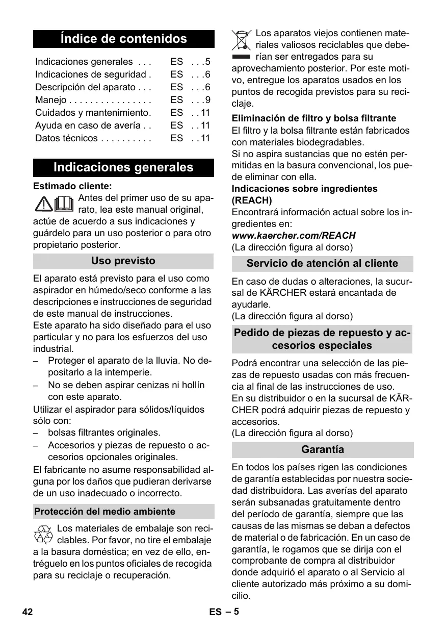 Elimination du filtre et du sac du filtre Le filtre et le sac du filtre sont fabriqués en matériaux recyclables. S'ils ne contiennent aucune substance aspirée dont l'élimination est interdite dans les déchets ménagers, vous pouvez les jeter dans les déchets ordinaires. Instructions relatives aux ingrédients (REACH) Les informations actuelles relatives aux ingrédients se trouvent sous : www.kaercher.com/REACH (Adresse au dos)