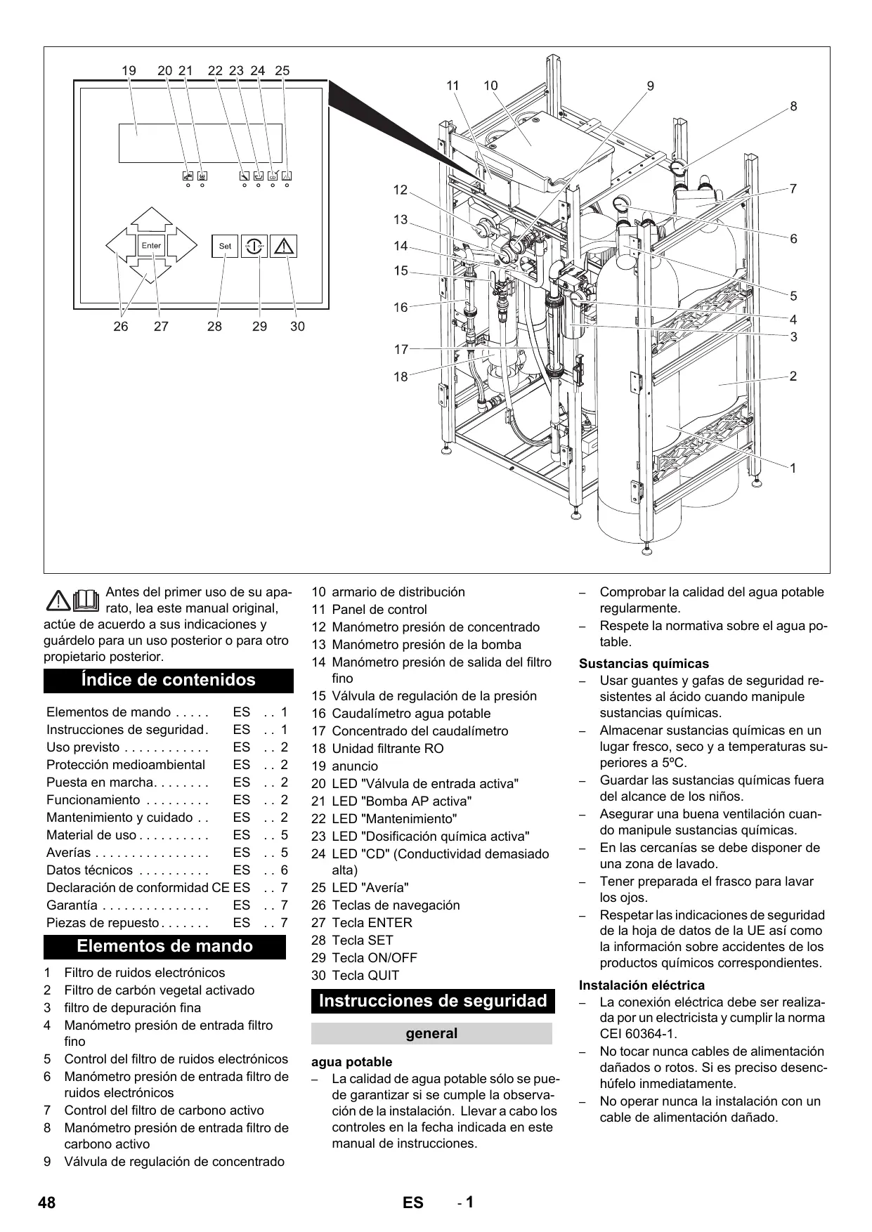 Contador de funcionamiento del filtro de ruidos | Se ha producido el lavado contracorriente en | Servicio técnico de Kär- electrénicos y carbono activo las ültimas 24 horas cher Diferencia de presiôn filtro fino mäximo 0,08 MPa Cambiar filtro fino Control visual de la instalaciôn sin fugas Servicio técnico de Kär- cher semanal- | Completar el protocolo de funcionamiento mente mensual | Limpiar y lavar el recipiente dosificador Comprobar visualmente la bomba de agua bruta | no se detectan daños/fugas Servicio técnico de Kär- cher Interruptor de flotador en el depésito de agua po- | no se reconoce ninguna averia en el funcio- | Servicio técnico de Kär- table namiento cher