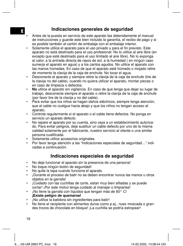 No toque ningún botón de seguridad! No quite la tapa cuando funciona el aparato. ¡Durante el proceso de batir no se deben encontrar nunca las manos u otros objetos en la garrafa! ¡Cuidado con las cuchillas de corte, estan muy bien afiladas y se puede cortar! ¡Por este motvo tenga cuidado al manejar o limpiarlas! ¡No llene la garrafa con líquidos que tengan más de 60° C! ¡Existe peligro de quemarse! ¡No utilice la batidora sin ingredientes para batir! No llene el recipiente con alimentos duros como p.ej., nuez moscada o grandes trozos de chocolate en bloque! ¡La cuchilla se podría estropear!