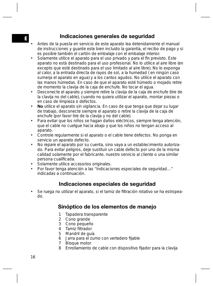 - Solamente utilise el aparato para el uso privado y para el fin previsto. Este aparato no está destinado para el uso profesional. No lo utilise al aire libre (en excepto que está选定rado para el uso limitado al aire libre). No lo exponga al calor, a la entrada directa de rayos de sol, a la humedad (en ningún caso sumerja el aparato en agua) y a los cantos agudos. No utilise el aparato con las manos humidas. En caso de que el aparato está humedo o mojado retire de momento la clavija de la caja de enchufe. No tocar el agua.