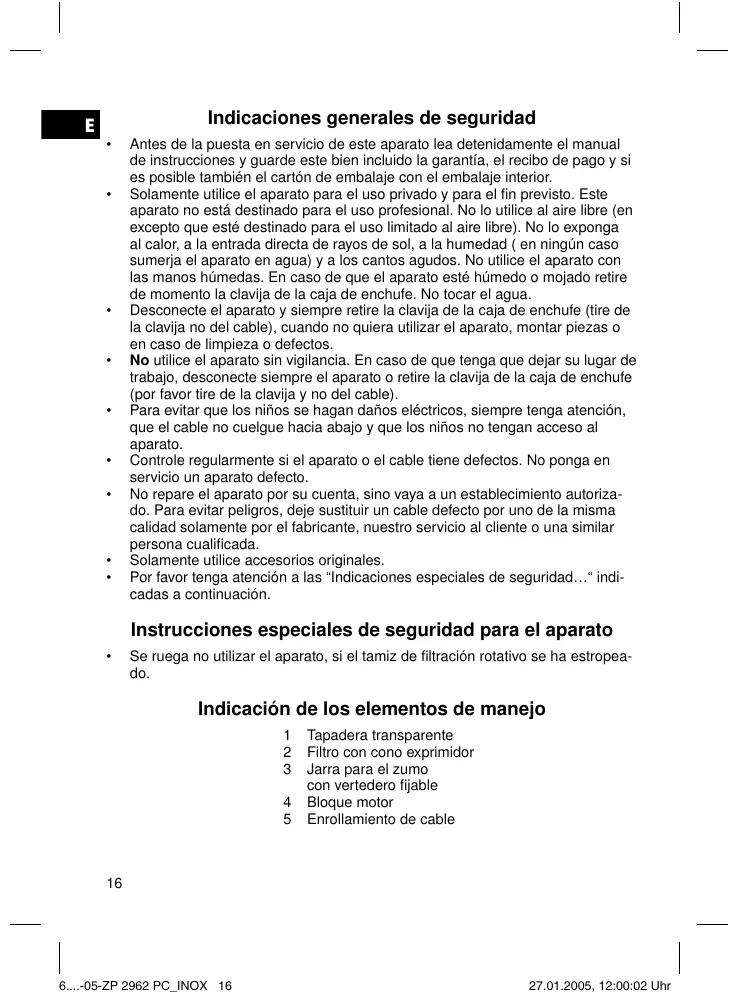Solamente utilice el aparato para el uso privado y para el fin previsto. Este aparato no está destinado para el uso profesional. No lo utilice al aire libre (en excepto que esté destinado para el uso limitado al aire libre). No lo exponga al calor, a la entrada directa de rayos de sol, a la humedad ( en ningún caso sumerja el aparato en agua) y a los cantos agudos. No utilice el aparato con las manos húmedas. En caso de que el aparato esté húmedo o mojado retire de momento la clavija de la caja de enchufe. No tocar el agua. Desconecte el aparato y siempre retire la clavija de la caja de enchufe (tire de la clavija no del cable), cuando no quiera utilizar el aparato, montar piezas o en caso de limpieza o defectos. No utilice el aparato sin vigilancia. En caso de que tenga que dejar su lugar de trabajo, desconecte siempre el aparato o retire la clavija de la caja de enchufe (por favor tire de la clavija y no del cable). Para evitar que los niños se hagan daños eléctricos, siempre tenga atención, que el cable no cuelgue hacia abajo y que los niños no tengan acceso al aparato. Controle regularmente si el aparato o el cable tiene defectos. No ponga en servicio un aparato defecto. No repare el aparato por su cuenta, sino vaya a un establecimiento autorizado. Para evitar peligros, deje sustituir un cable defecto por uno de la misma calidad solamente por el fabricante, nuestro servicio al cliente o una similar persona cualificada. Solamente utilice accesorios originales. Por favor tenga atención a las “Indicaciones especiales de seguridad…“ indicadas a continuación.