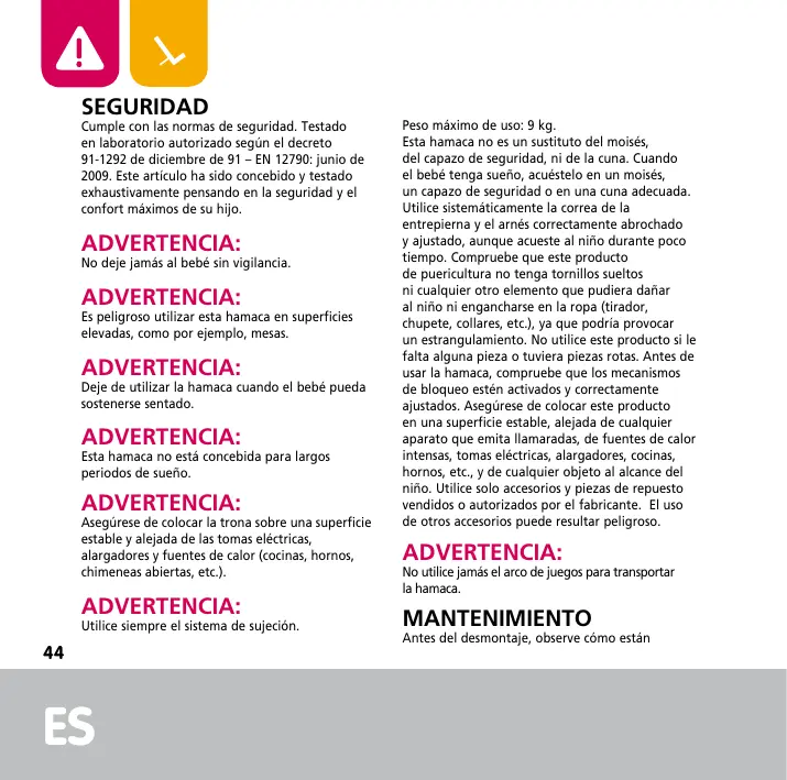 Peso máximo de uso: 9 kg. Esta hamaca no es un sustituto del moisés, del capazo de seguridad, ni de la cuna. Cuando el bebé tenga sueño, acuéstelo en un moisés, un capazo de seguridad o en una cuna adecuada. Utilice sistemáticamente la correa de la entrepierna y el arnés correctamente abrochado y ajustado, aunque acueste al niño durante poco tiempo. Compruebe que este producto de puericultura no tenga tornillos sueltos ni cualquier otro elemento que pudiera dañar al niño ni engancharse en la ropa (tirador, chupete, collares, etc.), ya que podría provocar un estrangulamiento. No utilice este producto si le falta alguna pieza o tuviera piezas rotas. Antes de usar la hamaca, compruebe que los mecanismos de bloqueo estén activados y correctamente ajustados. Asegúrese de colocar este producto en una superficie estable, alejada de cualquier aparato que emita llamaradas, de fuentes de calor intensas, tomas eléctricas, alargadores, cocinas, hornos, etc., y de cualquier objeto al alcance del niño. Utilice solo accesorios y piezas de repuesto vendidos o autorizados por el fabricante. El uso de otros accesorios puede resultar peligroso. ADVERTENCIA: No utilice jamás el arco de juegos para transportar la hamaca. MANTENIMIENTO Antes del desmontaje, observe cómo están