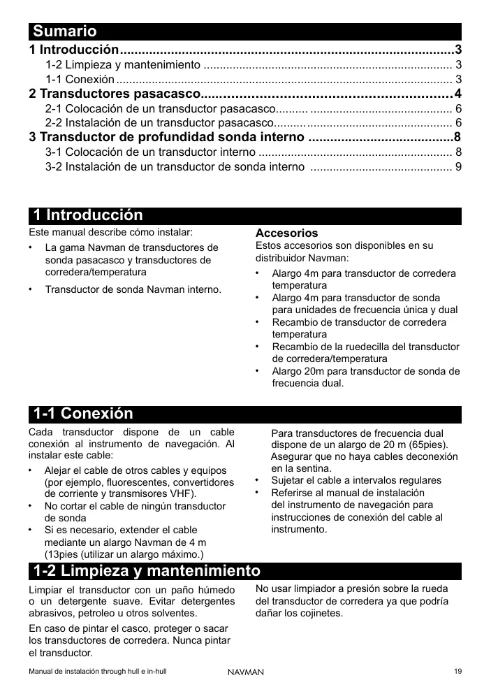 Cada transductor dispone de un cable conexión al instrumento de navegación. Al instalar este cable: Alejar el cable de otros cables y equipos (por ejemplo, fluorescentes, convertidores de corriente y transmisores VHF). No cortar el cable de ningún transductor de sonda Si es necesario, extender el cable mediante un alargo Navman de 4 m (13pies (utilizar un alargo máximo.)