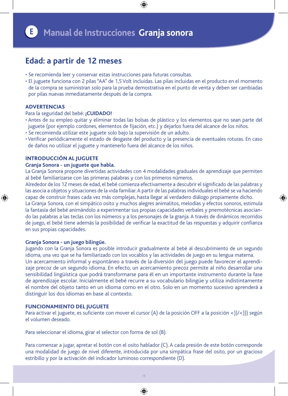 INTRODUCCIÓN AL JUGUETE Granja Sonora - un juguete que habla. La Granja Sonora propone divertidas actividades con 4 modalidades graduales de aprendizaje que permiten al bebé familiarizarse con las primeras palabras y con los primeros números. Alrededor de los 12 meses de edad, el bebé comienza efectivamente a descubrir el significado de las palabras y las asocia a objetos y situaciones de la vida familiar. A partir de las palabras individuales el bebé se va haciendo capaz de construir frases cada vez más complejas, hasta llegar al verdadero diálogo propiamente dicho. La Granja Sonora, con el simpático osito y muchos alegres animalitos, melodías y efectos sonoros, estimula la fantasía del bebé animándolo a experimentar sus propias capacidades verbales y pnemotécnicas asociando las palabras a las teclas con los números y a los personajes de la granja. A través de dinámicos recorridos de juego, el bebé tiene además la posibilidad de verificar la exactitud de las respuestas y adquirir confianza en sus propias capacidades. Granja Sonora - un juego bilingüe. Jugando con la Granja Sonora es posible introducir gradualmente al bebé al descubrimiento de un segundo idioma, una vez que se ha familiarizado con los vocablos y las actividades de juego en su lengua materna. Un acercamiento informal y espontáneo a través de la diversión del juego puede favorecer el aprendizaje precoz de un segundo idioma. En efecto, un acercamiento precoz permite al niño desarrollar una sensibilidad lingüística que podrá transformarse para él en un importante instrumento durante la fase de aprendizaje escolar. Inicialmente el bebé recurre a su vocabulario bilingüe y utiliza indistintamente el nombre del objeto tanto en un idioma como en el otro. Solo en un momento sucesivo aprenderá a distinguir los dos idiomas en base al contexto. FUNCIONAMIENTO DEL JUGUETE Para activar el juguete, es suficiente con mover el cursor (A) de la posición OFF a la posición <))/<))) según el volumen deseado. Para seleccionar el idioma, girar el selector con forma de sol (B). Para comenzar a jugar, apretar el botón con el osito hablador (C). A cada presión de este botón corresponde una modalidad de juego de nivel diferente, introducida por una simpática frase del osito, por un gracioso estribillo y por la activación del indicador luminoso correspondiente (D). 15 • La sustitución de las pilas correrá siempre por cuenta de un adulto. • Para sustituir las pilas: aflojar el tornillo de la tapa, con un destornillador, sacar la tapa, retirar las pilas agotadas e introducir las pilas nuevas teniendo cuidado de respetar la polaridad de inserción correcta (tal y como viene indicado en el producto), volver a colocar la tapa y apretar el tornillo hasta el tope. • No dejar las pilas ni otros instrumentos al alcance de los niños. • Retirar siempre las pilas agotadas del producto para evitar que eventuales pérdidas de líquido puedan dañarlo. • Retirar siempre las pilas en caso de inutilización prolongada del producto. • Emplear pilas alcalinas, iguales o equivalentes al tipo que se aconseja para hacer funcionar este producto. • No se deben mezclar tipos distintos de pilas, ni pilas descargadas con pilas nuevas. • No tirar al fuego ni al cubo de basura las pilas descargadas, sino eliminarlas depositándolas en el contenedor correspondiente. • No poner en corto circuito los bornes de alimentación. • Las pilas no recargables no se deben recargar: podrían estallar. • No se aconseja el uso de baterías recargables, podría disminuir la funcionalidad del juguete. • En caso de que se utilicen baterías recargables, extraerlas del juguete antes de recargarlas y efectuar la recarga sólo bajo la supervisión de un adulto.
