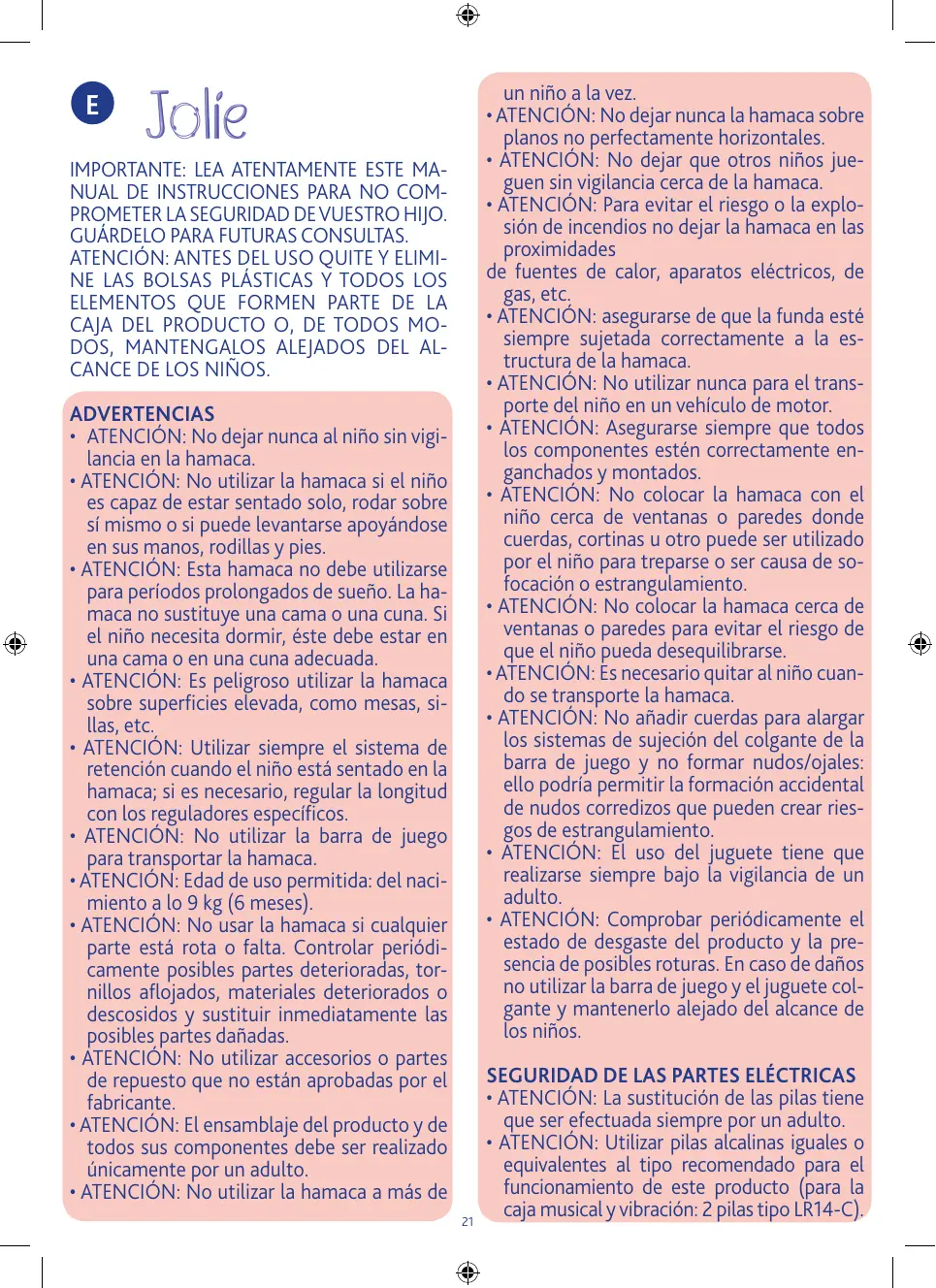 cal EC- Enganchar las patas delanteras al tubo del pie lateral X a través del perno específico, hasta que se oiga el clic de enganche (figura n. 2). Repetir la operación anterior con el pie lateral Y comprobando que el enganche se haya realizado correctamente con el “clic” correspondiente” (figura n. 3). Comprobar que la estructura esté ensamblada como se indica en la figura n. 4 y que los 2 pernos en la base de las patas delanteras se hayan enganchado correctamente. Enganchar el soporte del asiento anterior (C) en las articulaciones correspondientes (figura n. 5) incorporando las extremidades de la estructura tubular en el interior de las orificios correspondientes, hasta que se oiga el clic de enganche (figura n. 6). Repetir la misma operación para el soporte del asiento posterior (D) como se indica en la figura n. 7 e incorporarlo, controlando que los pernos se están enganchados correctamente (figura n. 8), hasta que se oiga el clic de enganche. Comprobar que los cuatro pernos están enganchados a las partes correspondientes. La caja se maneja mediante los botones: e. Botón menú: a.1) Pulsador de apagado de la caja (OFF) a.2 Selector de melodías relajantes (5 melodías) a.3 Selector de sonidos de la naturaleza (3 sonidos) f. B otón de deslizamiento de las melodías y sonidos de la naturaleza g. Botón de vibración: activa/desactiva la vibración. Pueden activarse dos intensidades de vibración alta y baja, mediante el botón mismo. La vibración puede ser utilizada también cuando la caja musical está apagada. h. Botón de volumen: Pueden activarse dos intensidades de volumen, alta y baja, mediante el botón mismo. MONTAJE Y DESENFUNDADO DE LA PARTE TEXTIL Desenganchar los 2 cinturones previstos en el reverso del asiento (figura n. 9) y abrir los velcros en el reverso de la parte inferior del asiento (figura n. 10). Posicionar la parte textil, manteniendo el apoyacabeza en el punto alto de la parte textil misma y sujetarla al soporte del asiento trasero tal y como se indica en la figura n. 11. Pasar los ojales de la parte textil por las articulaciones del soporte de la barra de juego tal y como se indica en la figura n°12. Después de comprobar que los velcros de la parte textil están abiertos (figura n. 10) asegurarse de que las correas estén al exterior del tubo (figura n. 13). Sujetar la parte textil alrededor de la caja musical (figura n. 14). Volcar la hamaca para cerrar los velcros (figura n. 15) y enganchar las dos correas laterales tal y como se indica en las figuras n. 16 y 17. Es posible extraer la parte textil y el minirreductor de la hamaca para lavarlos. Para desenfundar la parte textil proceder en sentido inverso con respecto al montaje de la parte textil misma.