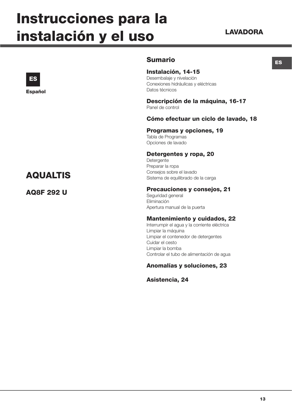 Instrucciones para la instalacién y el uso Sumario es Instalacién, 14-15 Desembalaje y nivelaciôn Conexiones hidräulicas y eléctricas Datos técnicos LAVADORA Español Descripcién de la mâquina, 16-17 Panel de control Cémo efectuar un ciclo de lavado, 18 Programas y opciones, 19 Tabla de Programas Opciones de lavado Detergentes y ropa, 20 Detergente Preparar la ropa Consejos sobre el lavado AQ UALTIS Sistema de equilibrado de la carga Precauciones y consejos, 21 AQ8F 292 U Seguridad general Eliminaciôn Apertura manual de la puerta Mantenimiento y cuidados, 22 Interrumpir el agua y la corriente eléctrica Limpiar la mâquina Limpiar el contenedor de detergentes Cuidar el cesto Limpiar la bomba Controlar el tubo de alimentacién de agua Anomalias y soluciones, 23 Asistencia, 24