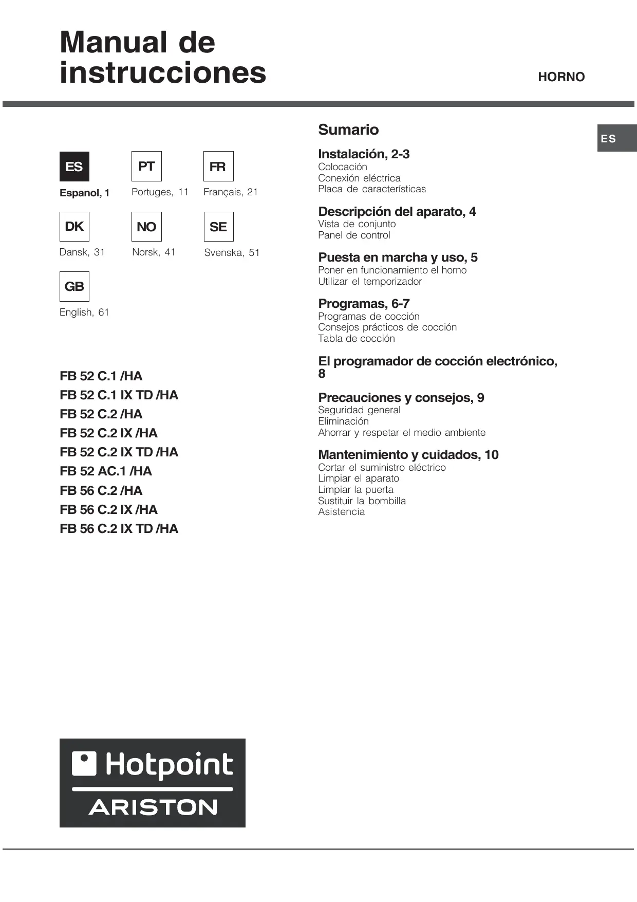 FB 52 C.2 IX/HA - Horno empotrado HOTPOINT - Manual de uso y guía de instrucciones gratis