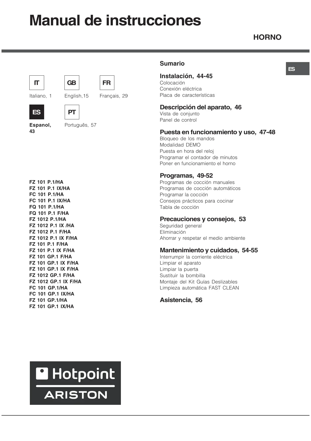 MANUAL DE USUARIO FZ 1012GP.1 IX F/HA HOTPOINT