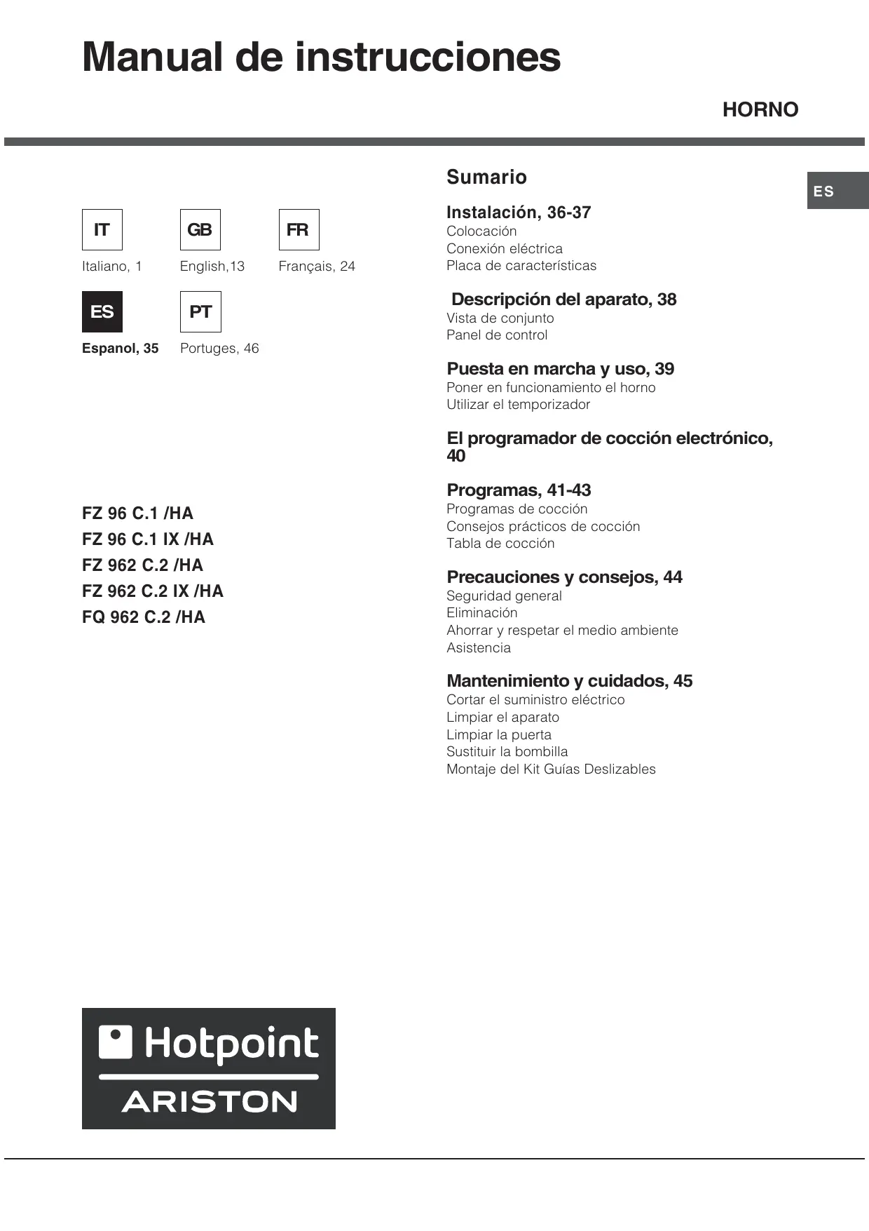 MANUAL DE USUARIO FZ 962 C.2 IX/HA HOTPOINT