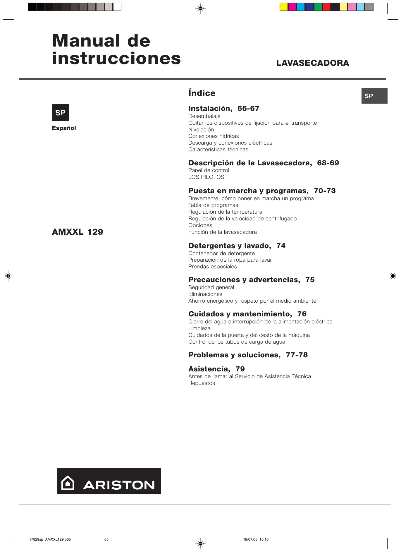 Desembalaje Quitar los dispositivos de fijación para el transporte Nivelación Conexiones hídricas Descarga y conexiones eléctricas Características técnicas Español Descripción de la Lavasecadora, 68-69 Panel de control LOS PILOTOS Puesta en marcha y programas, 70-73 Brevemente: cómo poner en marcha un programa Tabla de programas Regulación de la temperatura Regulación de la velocidad de centrifugado Opciones Función de la lavasecadora AMXXL 129 Detergentes y lavado, 74 Contenedor de detergente Preparación de la ropa para lavar Prendas especiales Precauciones y advertencias, 75 Seguridad general Eliminaciones Ahorro energético y respeto por el medio ambiente Cuidados y mantenimiento, 76 Cierre del agua e interrupción de la alimentación eléctrica Limpieza Cuidados de la puerta y del cesto de la máquina Control de los tubos de carga de agua Problemas y soluciones, 77-78 Asistencia, 79 Antes de llamar al Servicio de Asistencia Técnica Repuestos Tr7829sp_AMXXL129.p65