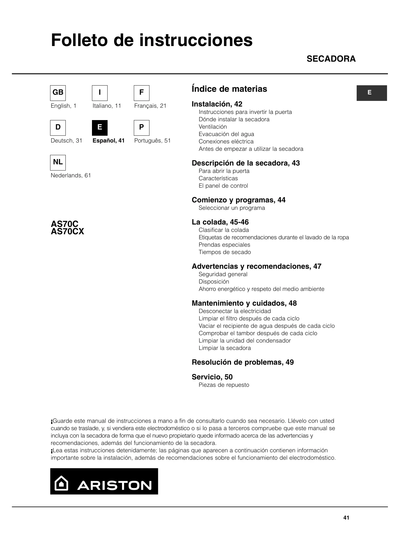 Português, 51 Instalación, 42 Instrucciones para invertir la puerta Dónde instalar la secadora Ventilación Evacuación del agua Conexiones eléctrica Antes de empezar a utilizar la secadora Descripción de la secadora, 43 Para abrir la puerta Características El panel de control Comienzo y programas, 44 Seleccionar un programa AS70C AS70CX La colada, 45-46 Clasificar la colada Etiquetas de recomendaciones durante el lavado de la ropa Prendas especiales Tiempos de secado Advertencias y recomendaciones, 47 Seguridad general Disposición Ahorro energético y respeto del medio ambiente Mantenimiento y cuidados, 48 Desconectar la electricidad Limpiar el filtro después de cada ciclo Vaciar el recipiente de agua después de cada ciclo Comprobar el tambor después de cada ciclo Limpiar la unidad del condensador Limpiar la secadora Resolución de problemas, 49 Servicio, 50 Piezas de repuesto ¡Guarde este manual de instrucciones a mano a fin de consultarlo cuando sea necesario. Llévelo con usted cuando se traslade, y, si vendiera este electrodoméstico o si lo pasa a terceros compruebe que este manual se incluya con la secadora de forma que el nuevo propietario quede informado acerca de las advertencias y recomendaciones, además del funcionamiento de la secadora. ¡Lea estas instrucciones detenidamente; las páginas que aparecen a continuación contienen información importante sobre la instalación, además de recomendaciones sobre el funcionamiento del electrodoméstico.