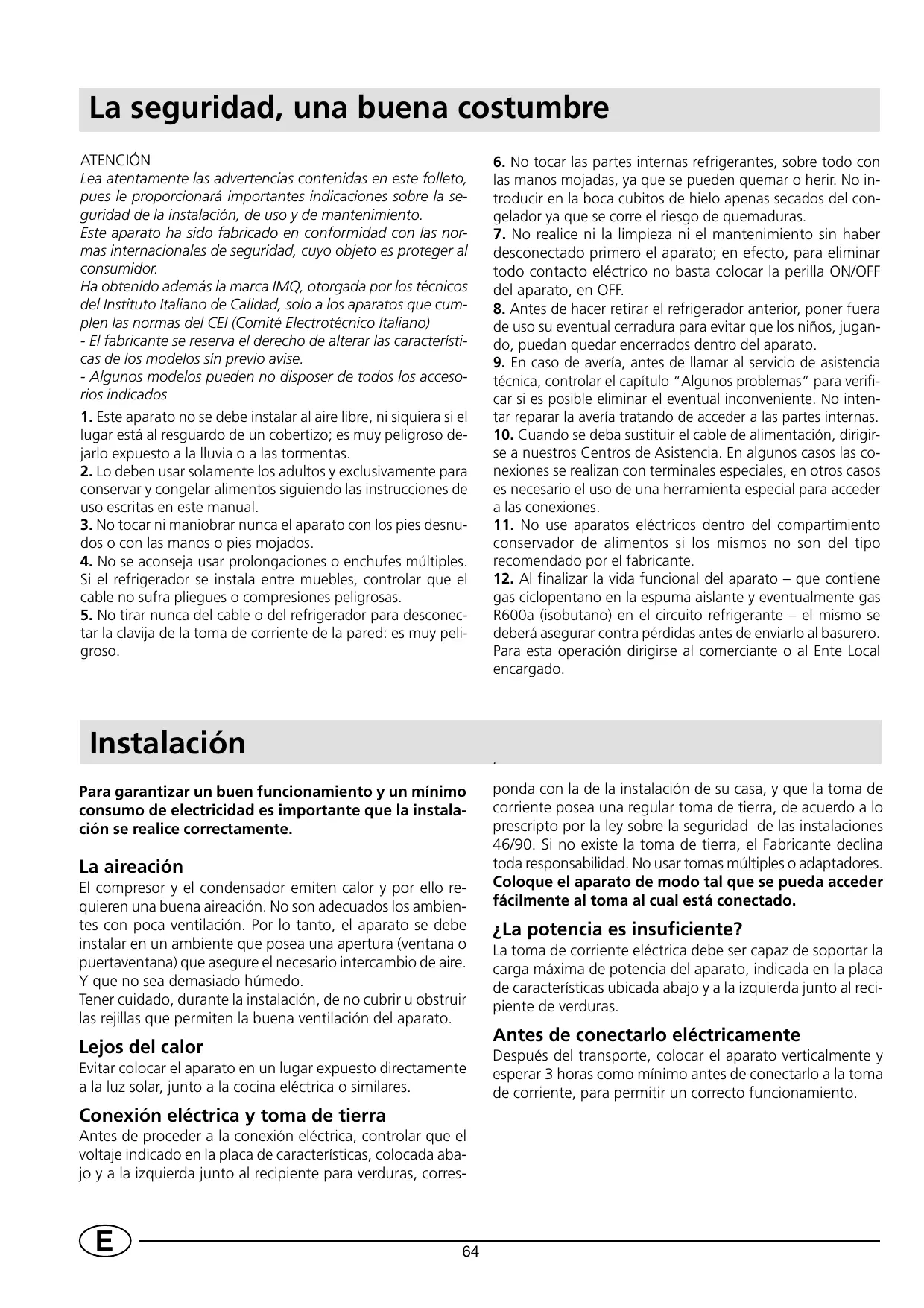 Instrucciones para la instalación y uso A temperatura ambiente Spinaci A temperatura ambiente A temperatura ambiente Cibi vari Preparazione Scottatura Confezionamento Non necessario A temperatura ambiente La seguridad, una buena costumbre ATENCIÓN Lea atentamente las advertencias contenidas en este folleto, pues le proporcionará importantes indicaciones sobre la seguridad de la instalación, de uso y de mantenimiento. Este aparato ha sido fabricado en conformidad con las normas internacionales de seguridad, cuyo objeto es proteger al consumidor. Ha obtenido además la marca IMQ, otorgada por los técnicos del Instituto Italiano de Calidad, solo a los aparatos que cumplen las normas del CEI (Comité Electrotécnico Italiano) - El fabricante se reserva el derecho de alterar las características de los modelos sín previo avise. - Algunos modelos pueden no disposer de todos los accesorios indicados