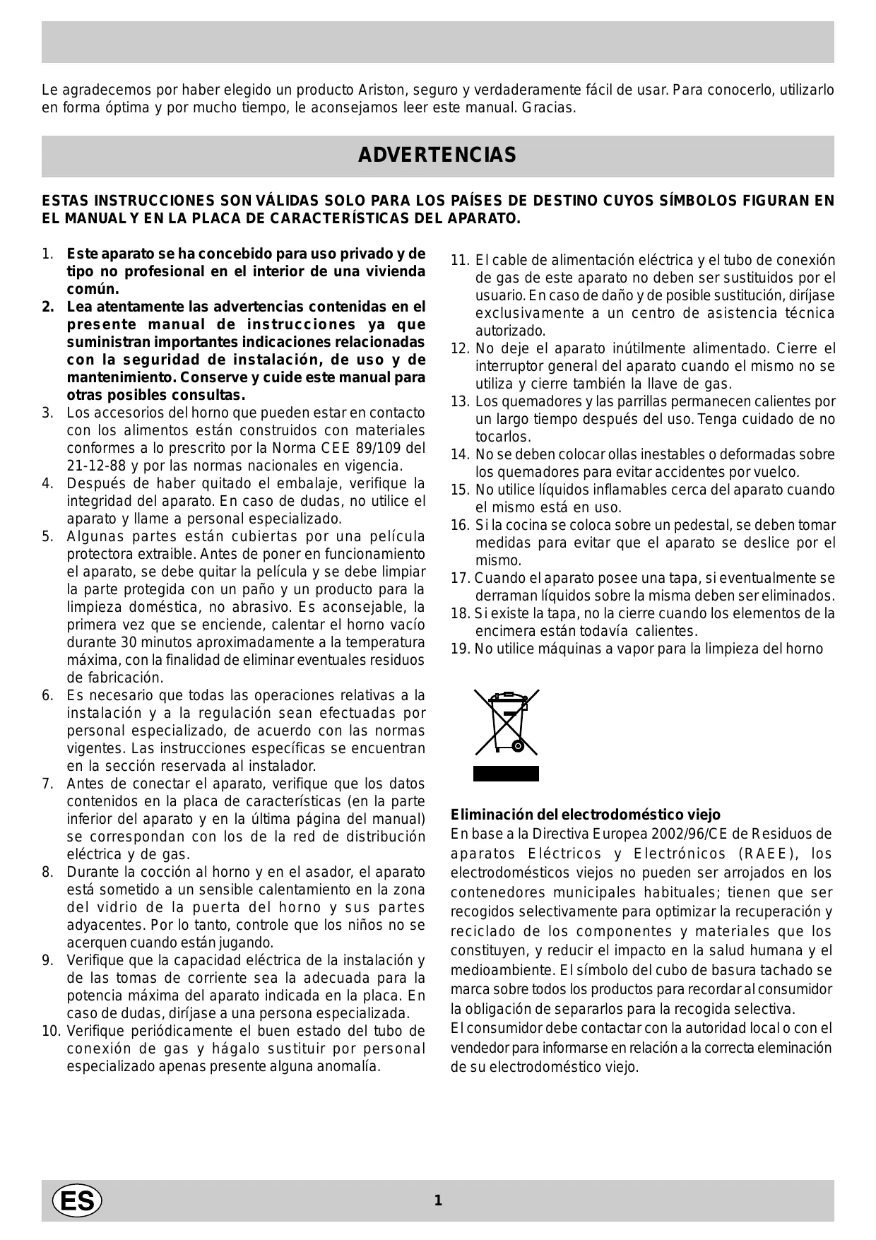 ADVERTENCIAS ESTAS INSTRUCCIONES SON VÁLIDAS SOLO PARA LOS PAÍSES DE DESTINO CUYOS SÍMBOLOS FIGURAN EN EL MANUAL Y EN LA PLACA DE CARACTERÍSTICAS DEL APARATO. 1. Este aparato se ha concebido para uso privado y de tipo no profesional en el interior de una vivienda común. 2. Lea atentamente las advertencias contenidas en el presente manual de instrucciones ya que suministran importantes indicaciones relacionadas con la seguridad de instalación, de uso y de mantenimiento. Conserve y cuide este manual para otras posibles consultas. 3. Los accesorios del horno que pueden estar en contacto con los alimentos están construidos con materiales conformes a lo prescrito por la Norma CEE 89/109 del 21-12-88 y por las normas nacionales en vigencia. 4. Después de haber quitado el embalaje, verifique la integridad del aparato. En caso de dudas, no utilice el aparato y llame a personal especializado. 5. Algunas partes están cubiertas por una película protectora extraible. Antes de poner en funcionamiento el aparato, se debe quitar la película y se debe limpiar la parte protegida con un paño y un producto para la limpieza doméstica, no abrasivo. Es aconsejable, la primera vez que se enciende, calentar el horno vacío durante 30 minutos aproximadamente a la temperatura máxima, con la finalidad de eliminar eventuales residuos de fabricación. 6. Es necesario que todas las operaciones relativas a la instalación y a la regulación sean efectuadas por personal especializado, de acuerdo con las normas vigentes. Las instrucciones específicas se encuentran en la sección reservada al instalador. 7. Antes de conectar el aparato, verifique que los datos contenidos en la placa de características (en la parte inferior del aparato y en la última página del manual) se correspondan con los de la red de distribución eléctrica y de gas. 8. Durante la cocción al horno y en el asador, el aparato está sometido a un sensible calentamiento en la zona del vidrio de la puer ta del horno y sus par tes adyacentes. Por lo tanto, controle que los niños no se acerquen cuando están jugando. 9. Verifique que la capacidad eléctrica de la instalación y de las tomas de corriente sea la adecuada para la potencia máxima del aparato indicada en la placa. En caso de dudas, diríjase a una persona especializada. 10. Verifique periódicamente el buen estado del tubo de conexión de gas y hágalo sustituir por personal especializado apenas presente alguna anomalía.