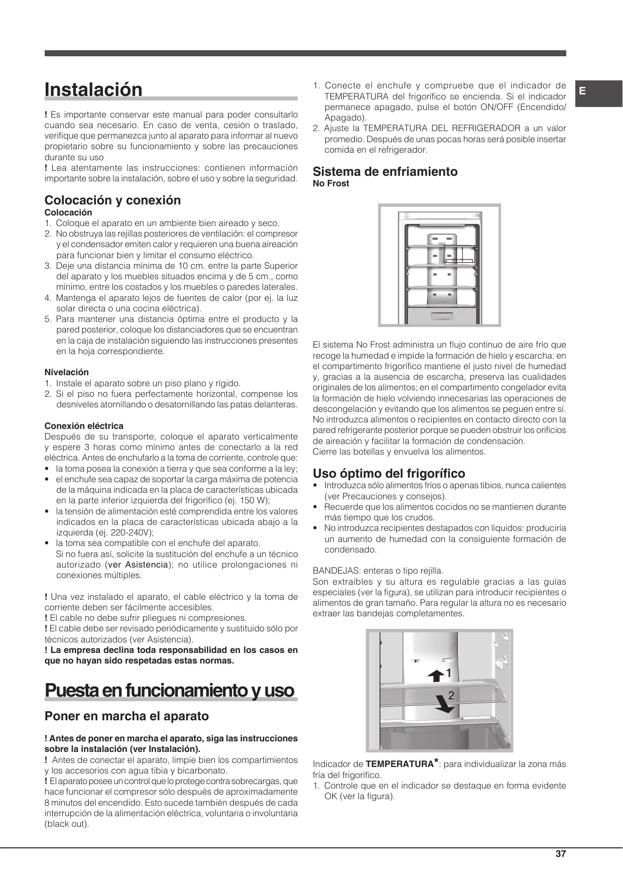 - la toma sea compatible con el enchufe del aparato. Si no fuera así, solicite la sustitución del enchufe a un técnico autorizado (ver Asistencia); no utilice prolongaciones ni conexiones múltiples. ! Una vez instalado el aparato, el cable eléctrico y la toma de corriente deben ser fácilmente accesibles. ! El cable no debe sufrir pliegues ni compresiones. ! El cable debe ser revisado periódicamente y sustituido sólo por técnicos autorizados (ver Asistencia). ! La empresa declina toda responsabilidad en los casos en que no hayan sido respetadas estas normas. El sistema No Frost administra un flujo continuo de aire frío que recoge la humedad e impide la formación de hielo y escarcha: en el compartimento frigorífico mantiene el justo nivel de humedad y, gracias a la ausencia de escarcha, preserva las cualidades originales de los alimentos; en el compartimento congelador evita la formación de hielo volviendo innecesarias las operaciones de descongelación y evitando que los alimentos se peguen entre sí. No introduzca alimentos o recipientes en contacto directo con la pared refrigerante posterior porque se pueden obstruir los orificios de aireación y facilitar la formación de condensación. Cierre las botellas y envuelva los alimentos. Uso óptimo del frigorífico
