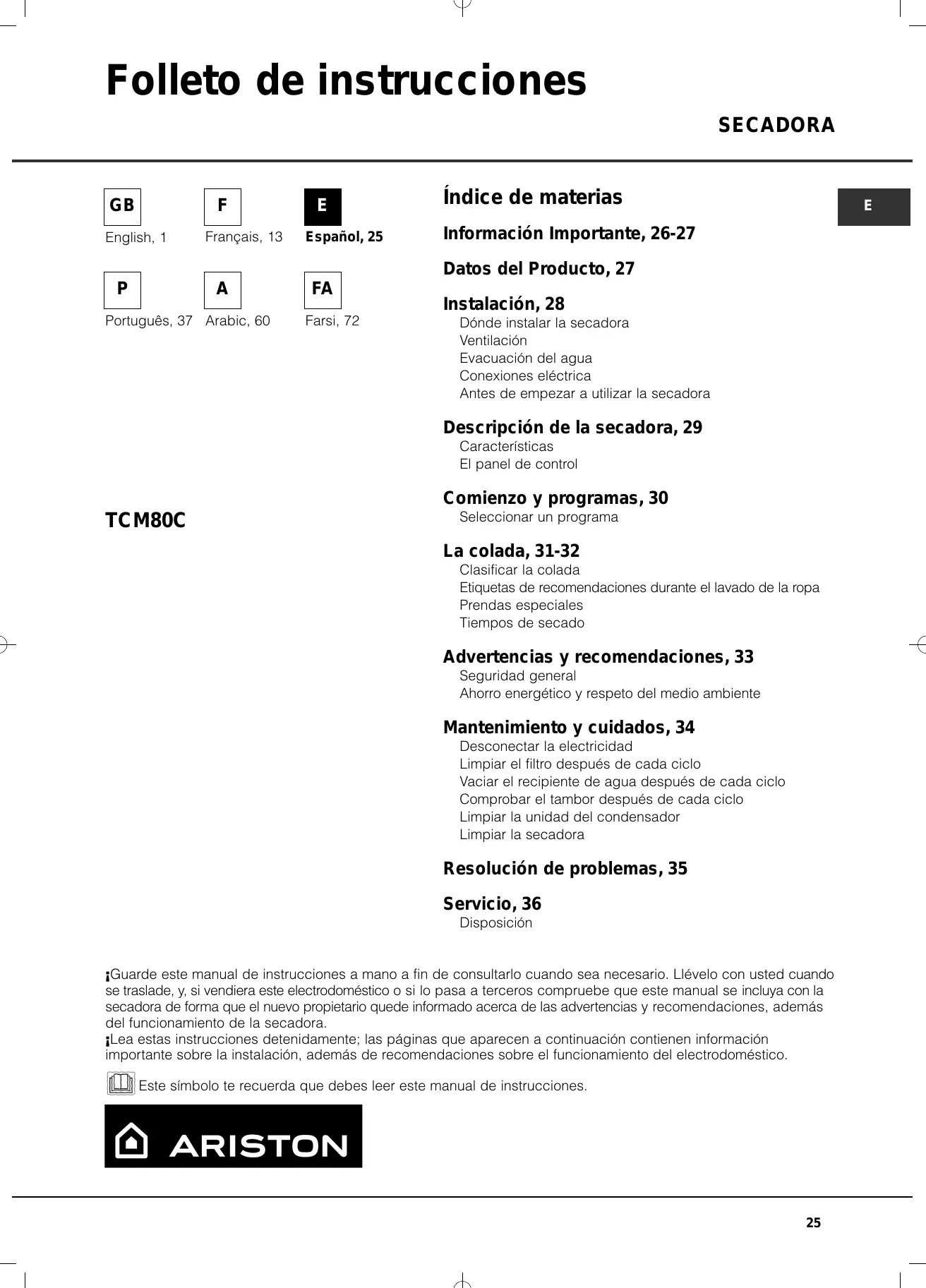 TCM80C 6P - Secadora HOTPOINT - Manual de uso y guía de instrucciones gratis